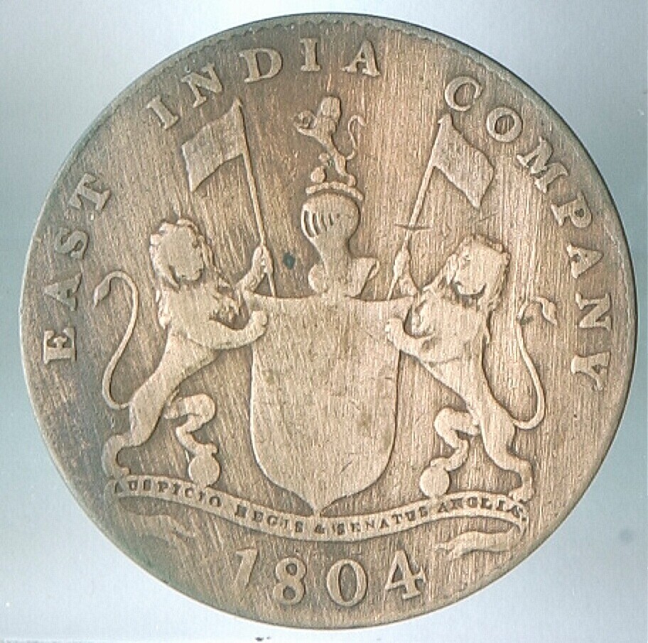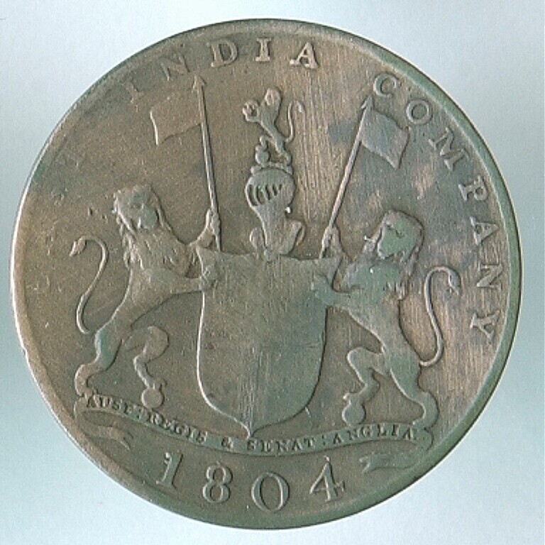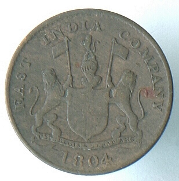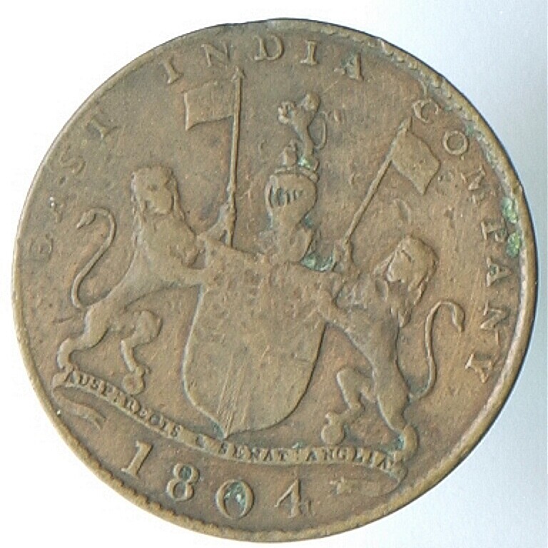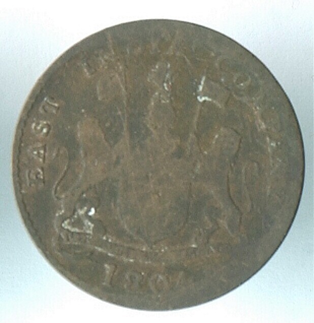 Koperen twee kepeng munt van de 'East India Company'...