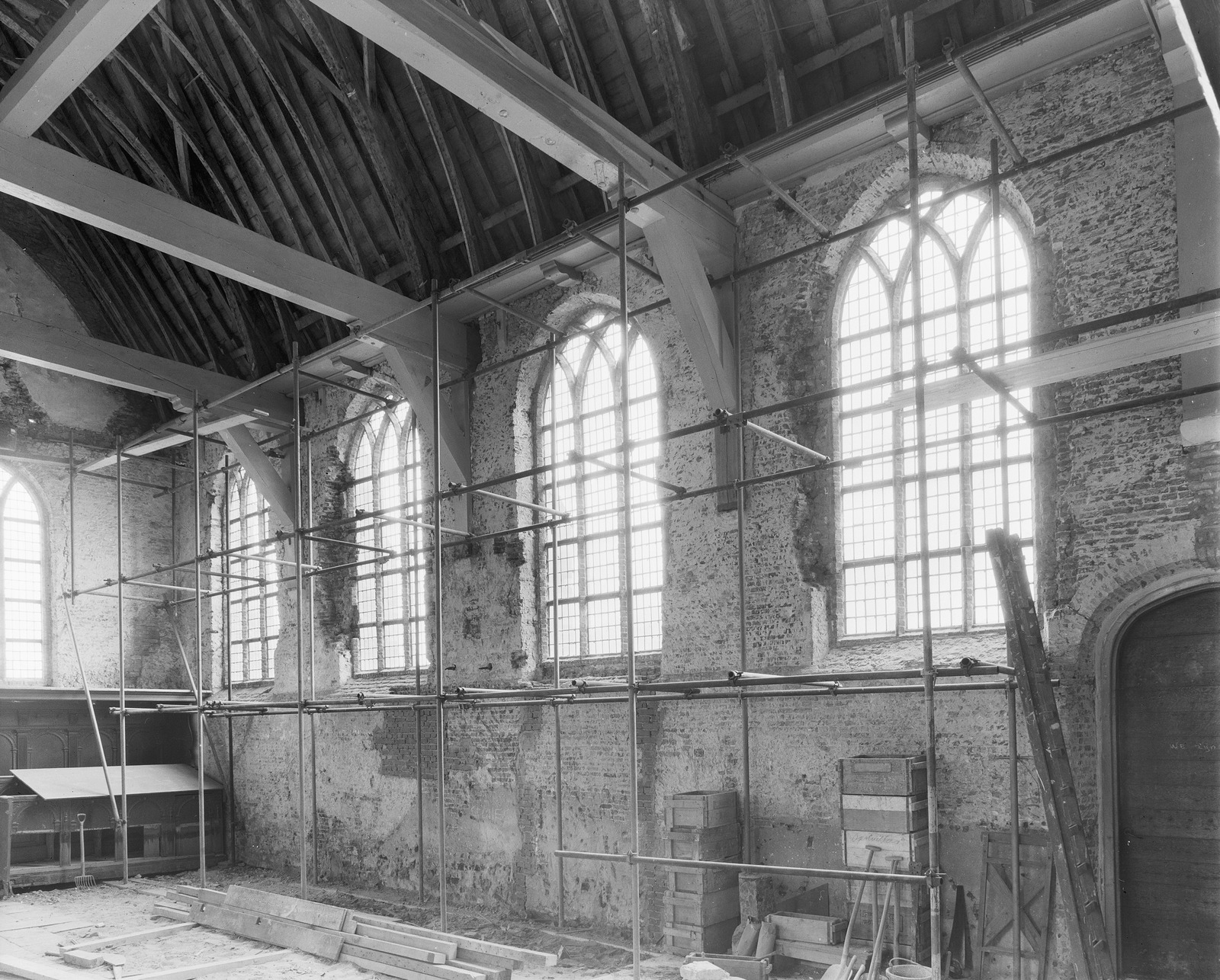 Interieur, overzicht glas-in-loodraam met een ontbre...