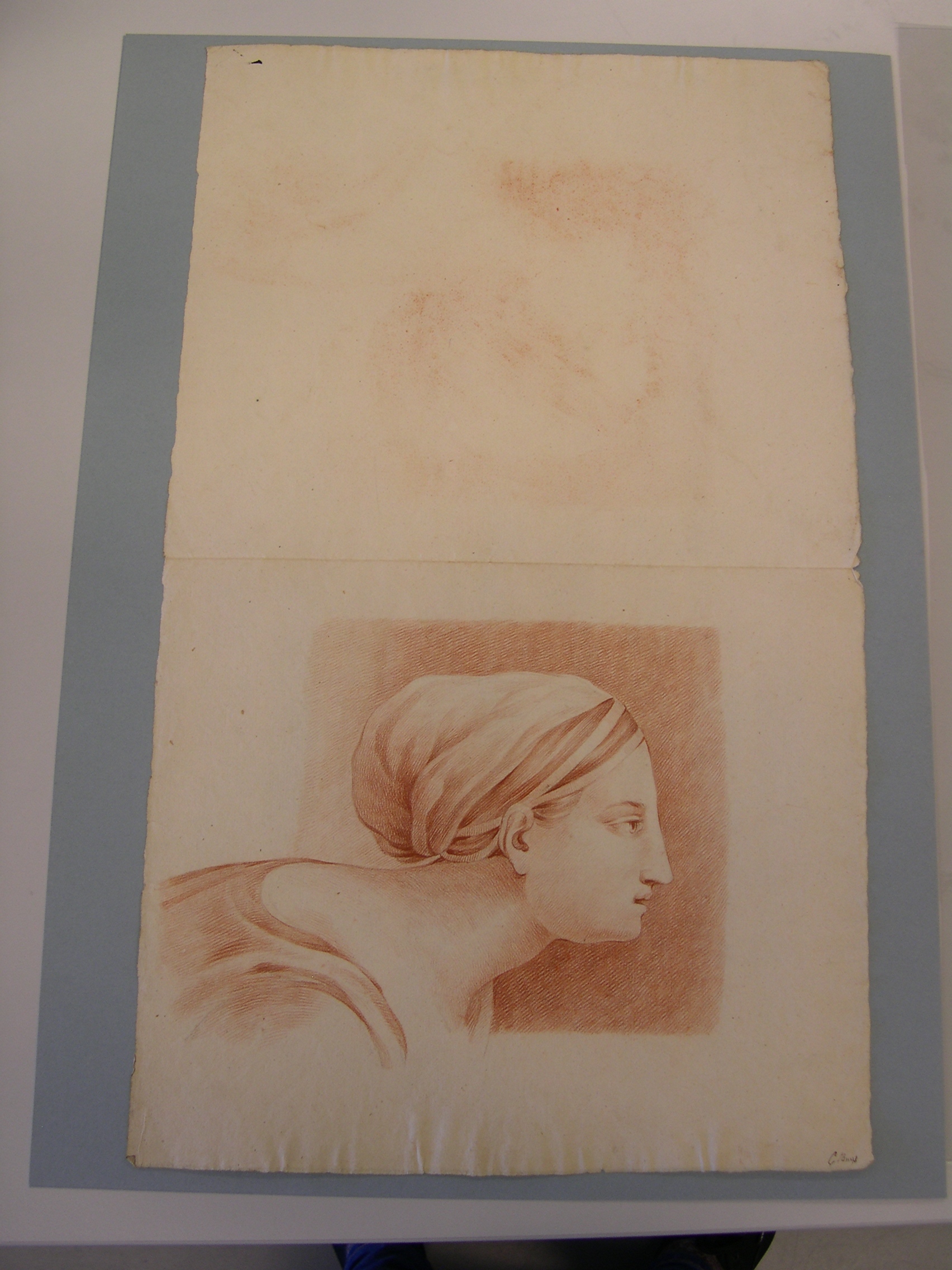 Portrettekening van een vrouw met opgestoken haar