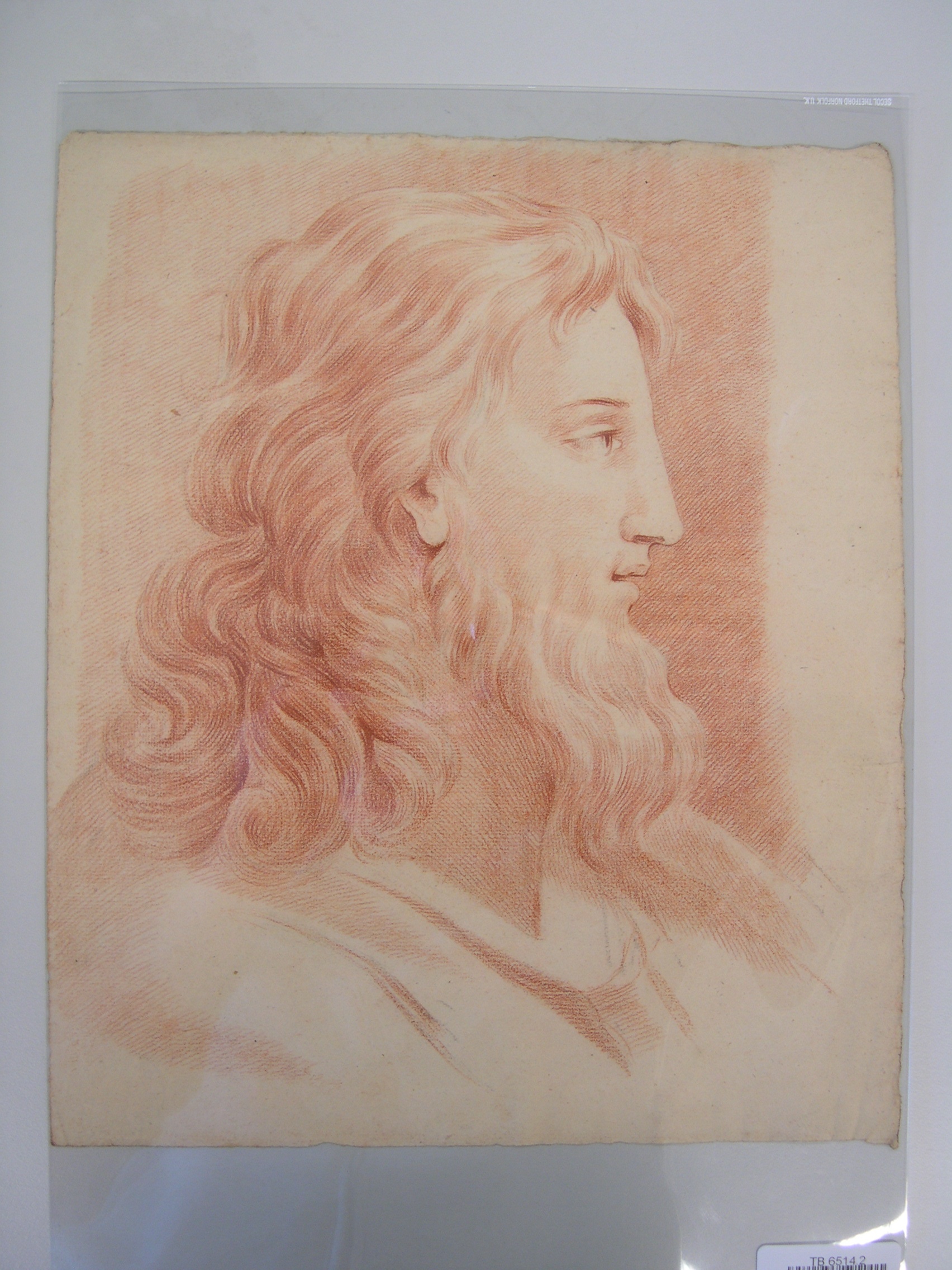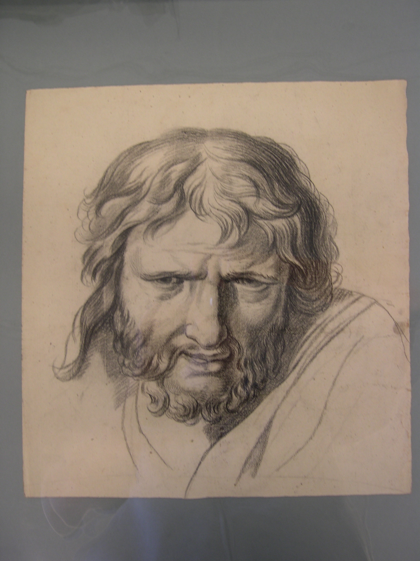 Portrettekening van een man met lang haar en een baard