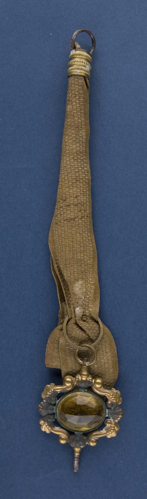 Horlogesleutel van koper, bevestigd aan een lint met...