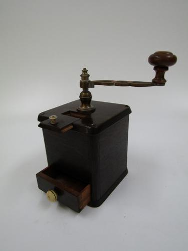 Eikenhouten schootkoffiemolen met messing vultrechte...