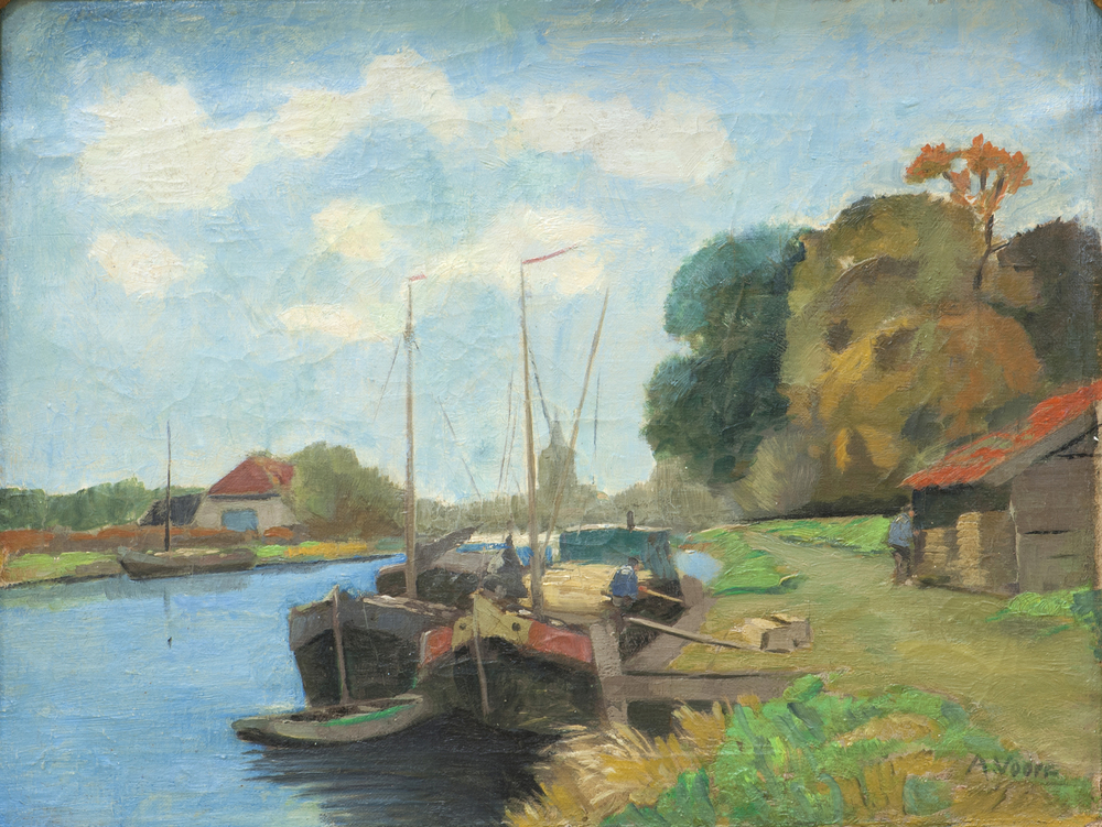 Schilderij met daarop schepen en een schuur