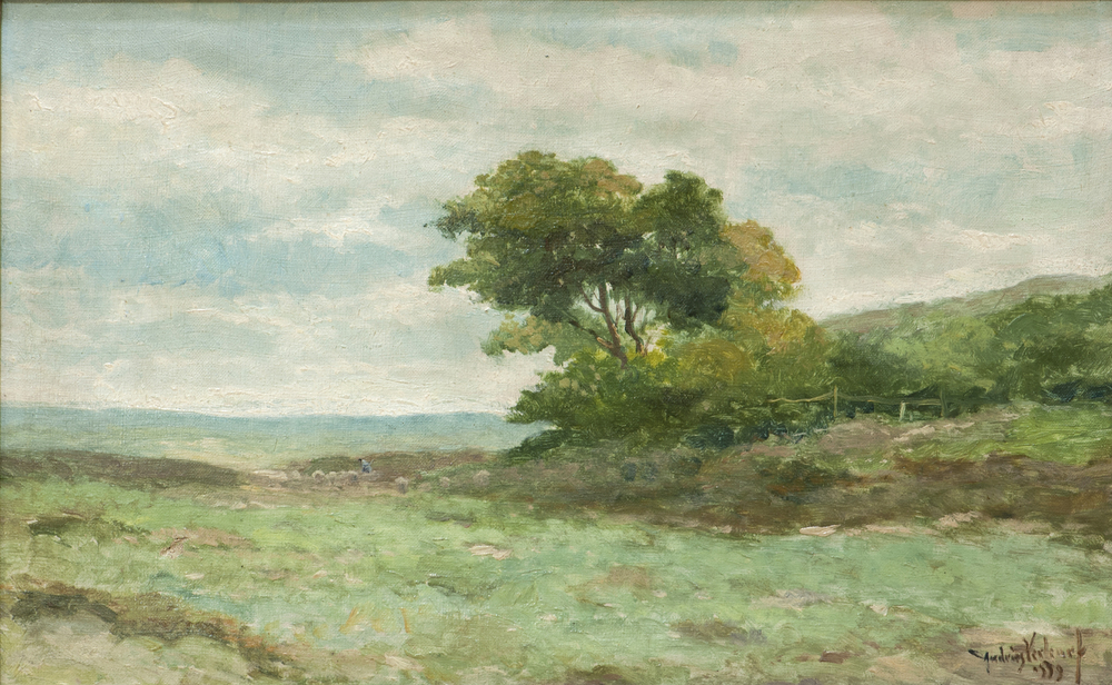 Schilderij met daarop een herder met kudde in een he...