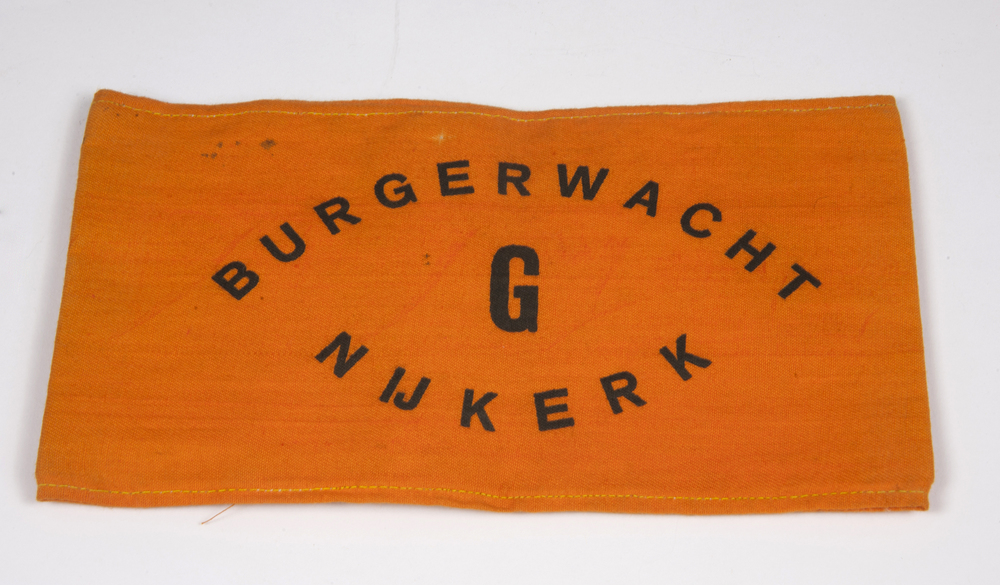 Oranje band met opschrift 'BURGERWACHT NIJKERK. G'