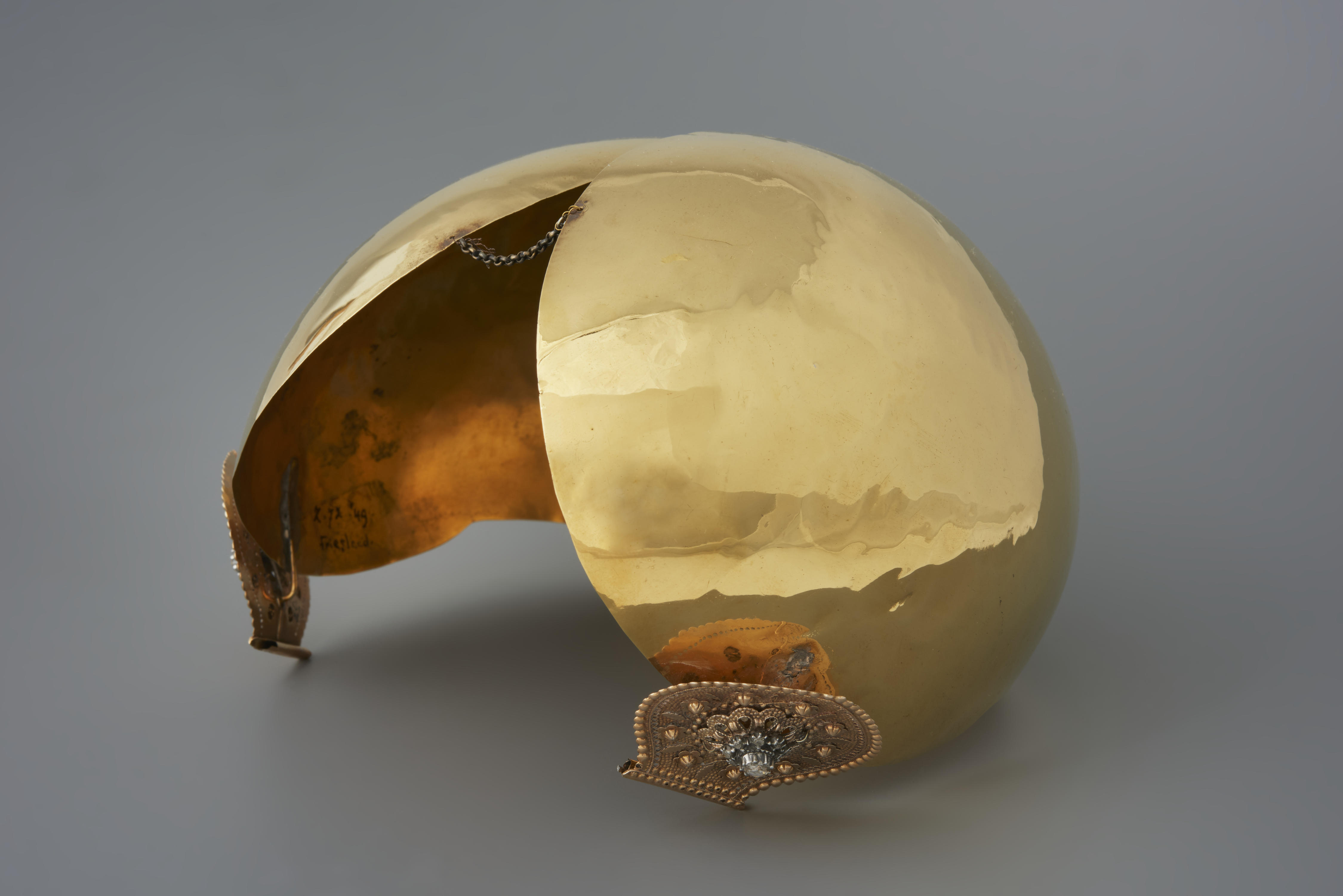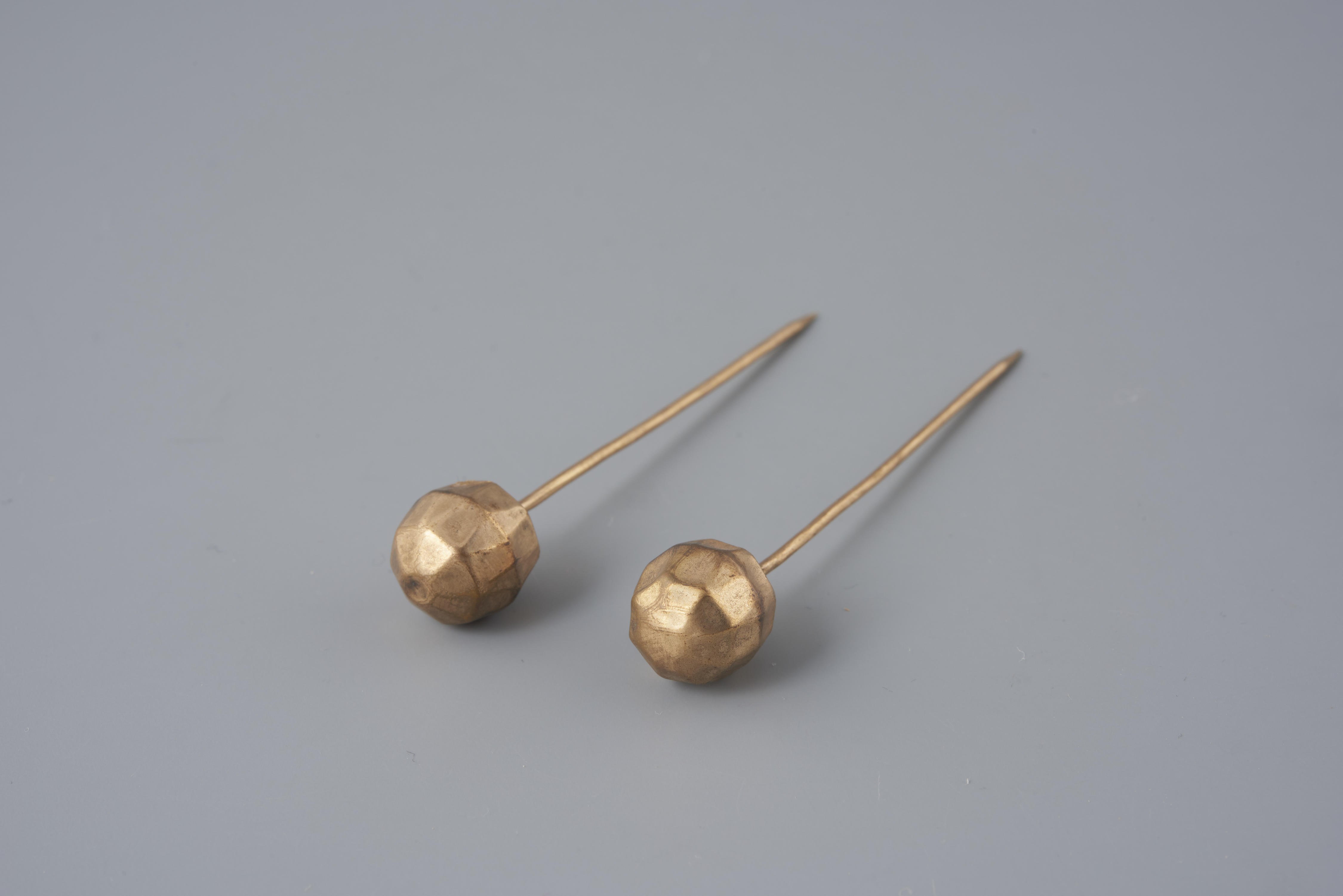 Verguld messing oorijzer met gouden stiften uit Frie...