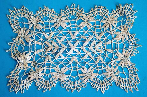 Haakwerk, rond wit katoenen kleedje met zes geometri...