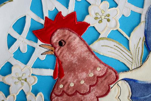 Borduurwerk, rond zijde kleedje, met een geel, rood,...