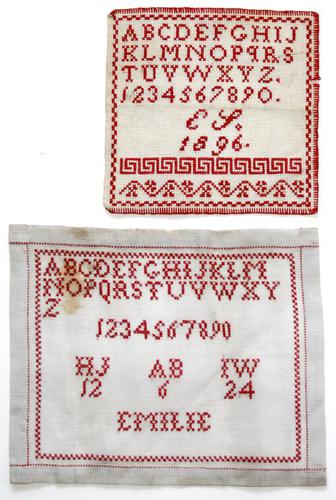 Borduurwerk Oefenlappen, stramien. EJ 1896 en Emile