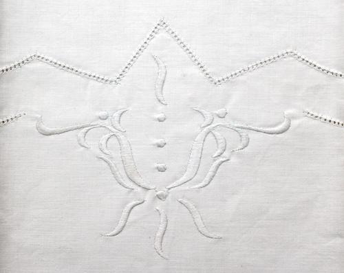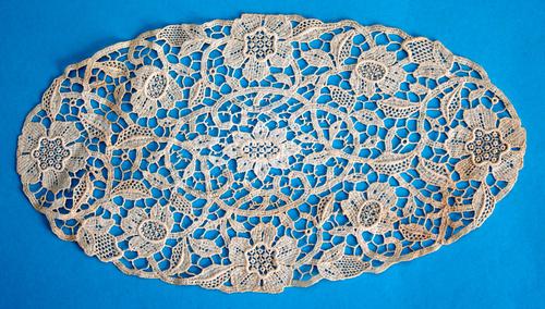 Haakwerk, wit/ecru ovalen kanten katoenen kleedje.