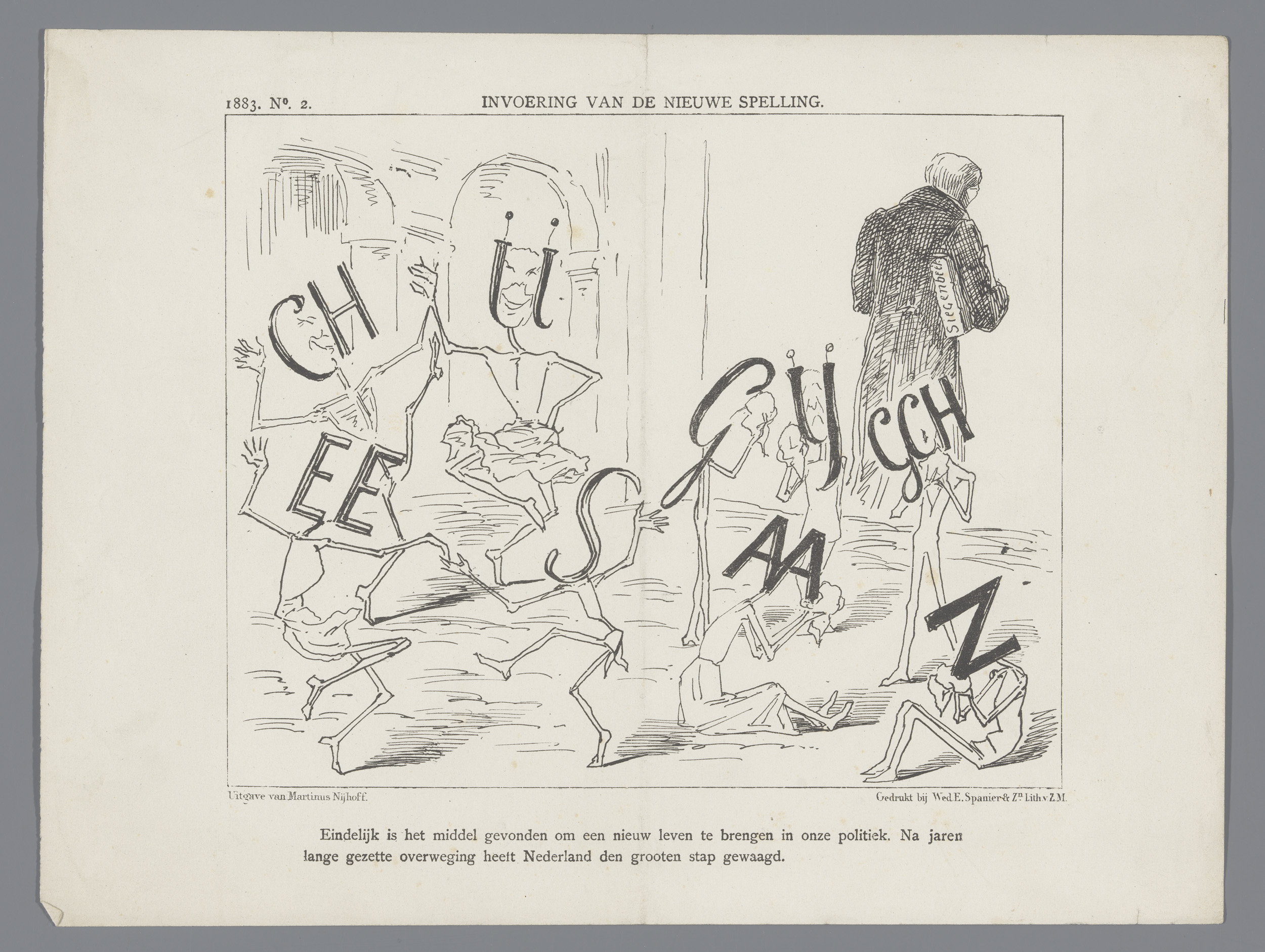 Spotprent bij de invoering van de nieuwe spelling, 1883