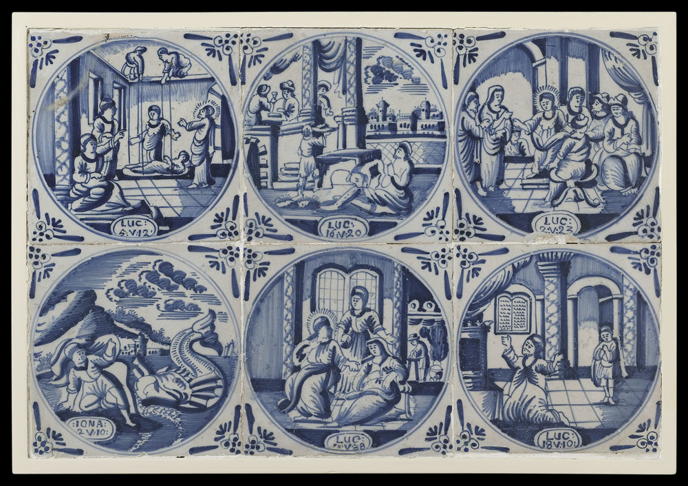 Tegels van aardewerk met tinglazuur, voorstellende v...