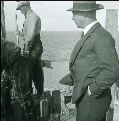 Kraan op een ponton bij de bouw van de Afsluitdijk