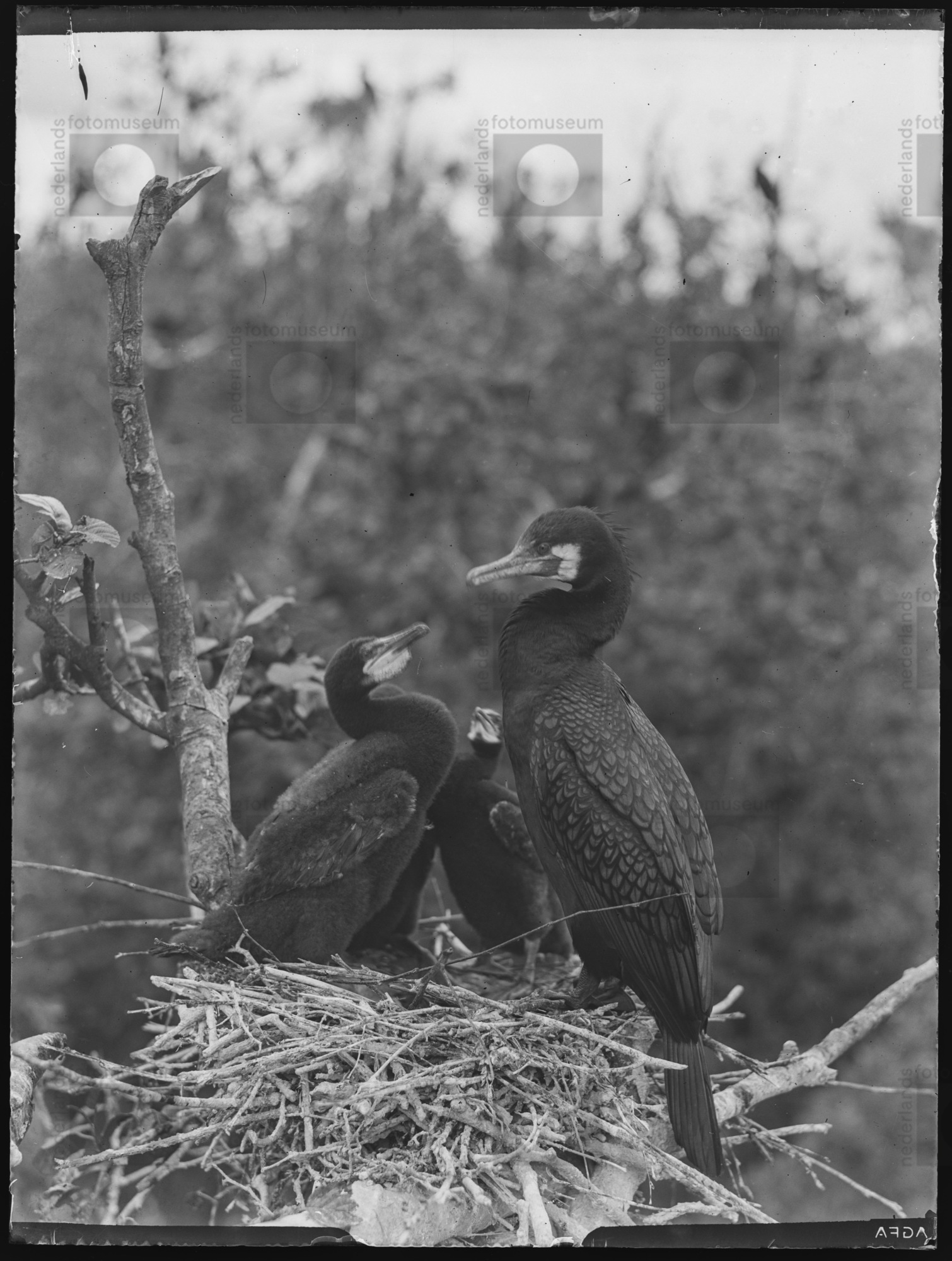 Aalscholver met jongen op nest, Wanneperveen (1944)