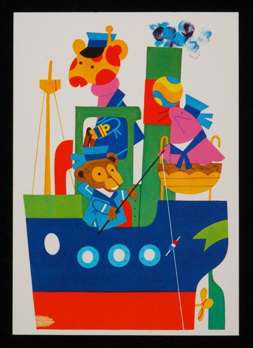 Prentbriefkaart voor het kind: giraf en beer op boot