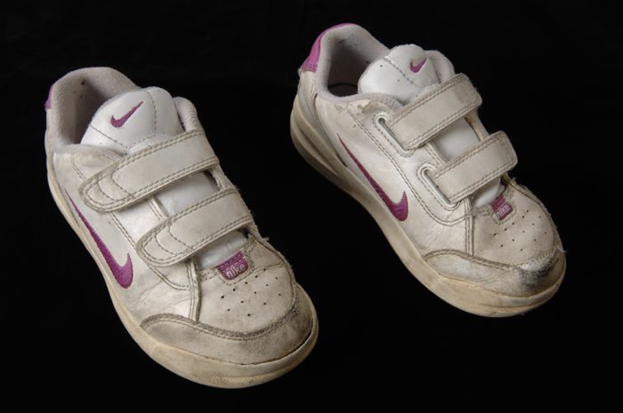 Paar witte sneakers, merk Nike, met klittenbandsluit...