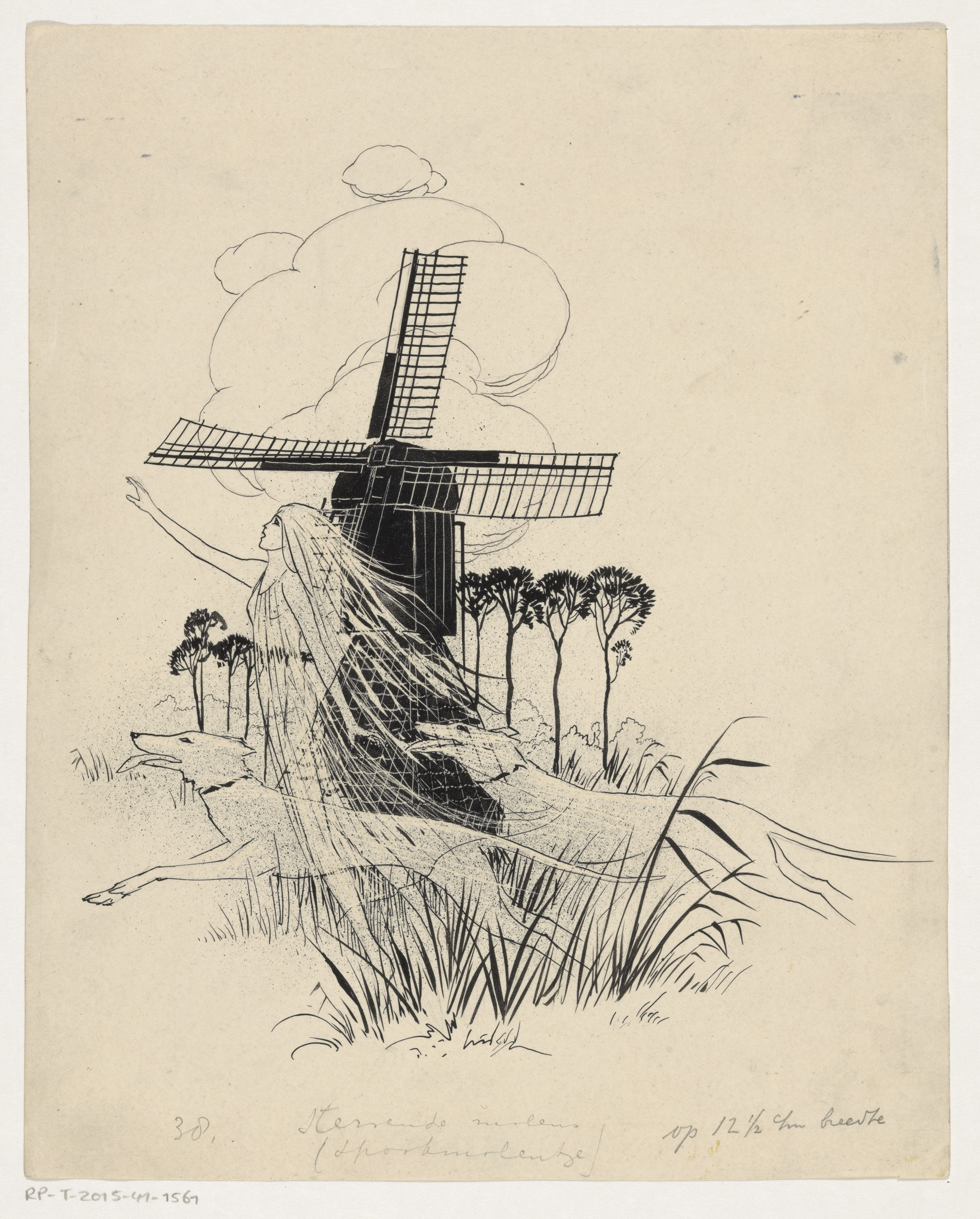 Schim van een meisje en twee honden bij een molen