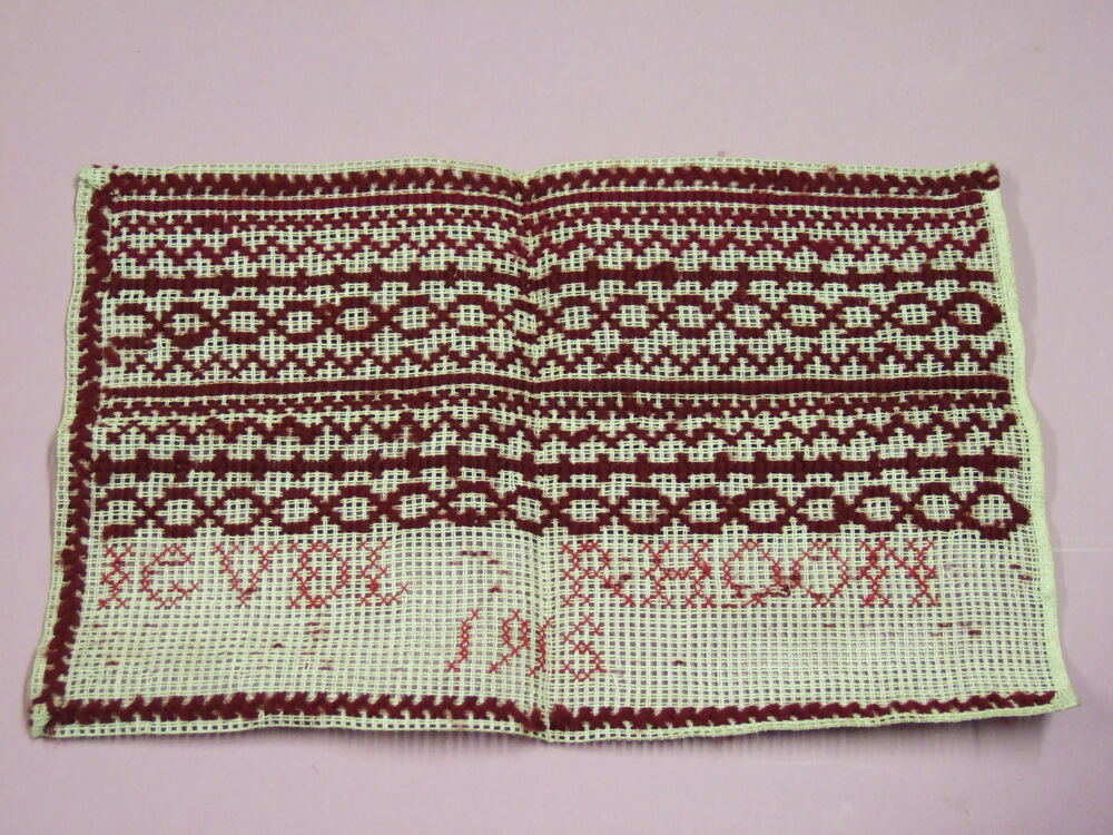 Merklap van katoen met letters in wollen borduurgaren.