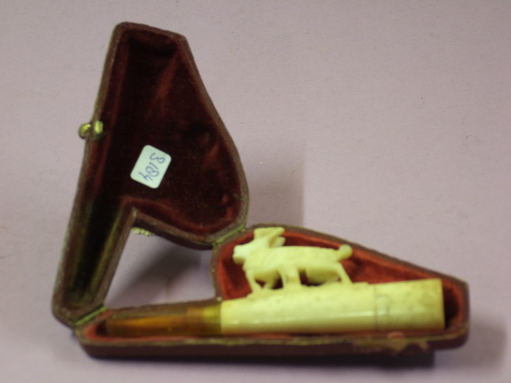 Sigarenpijpje van been met barnsteen mondstuk in etui.