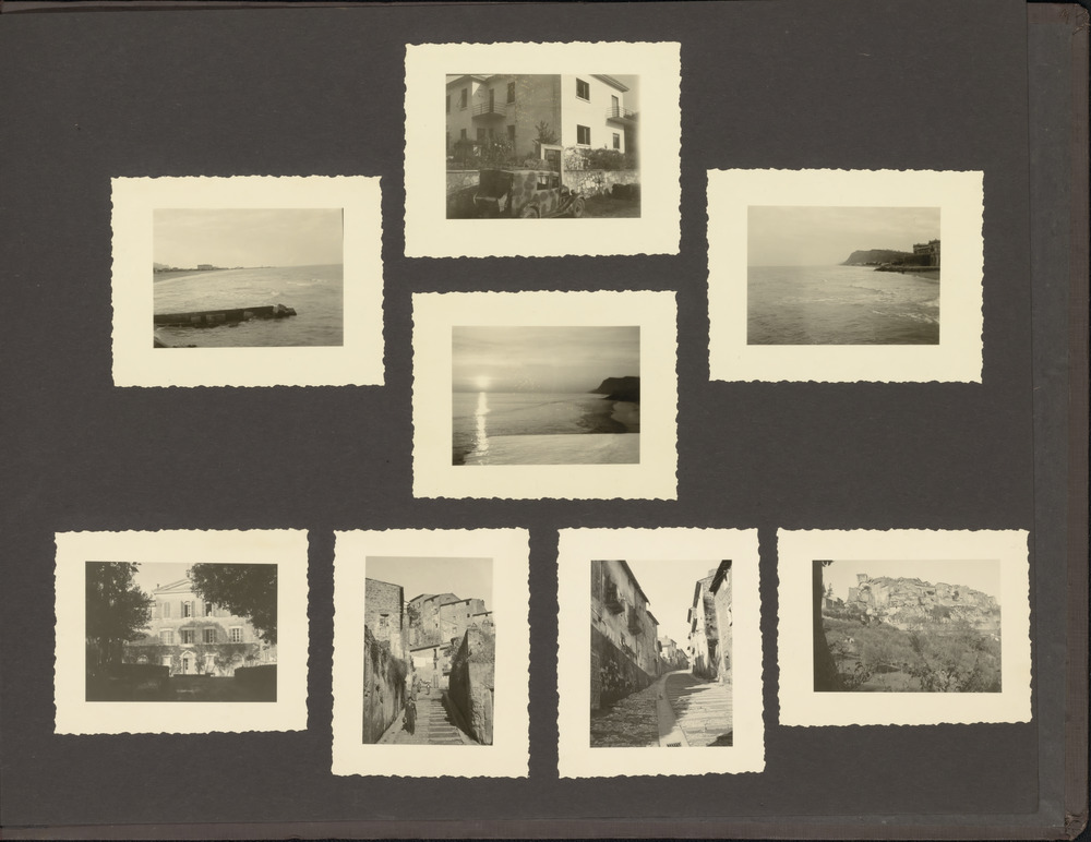 Acht foto's van gebouwen, een meer en een bergdorpje