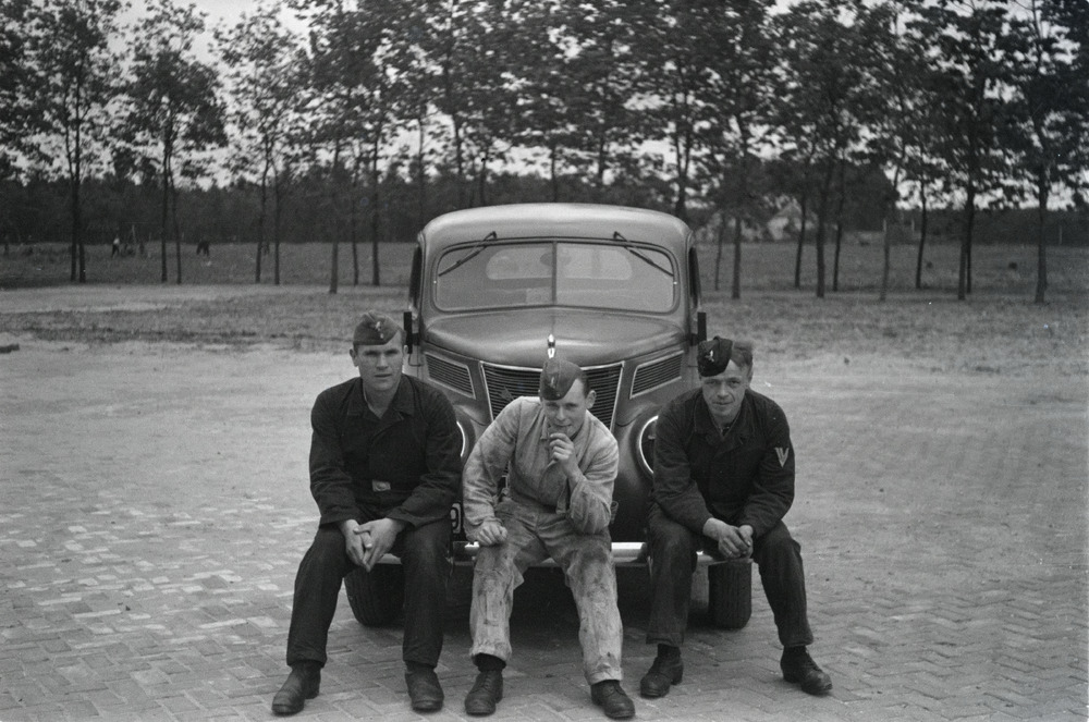 Drie Duitse militairen zittend op de bumper van een ...