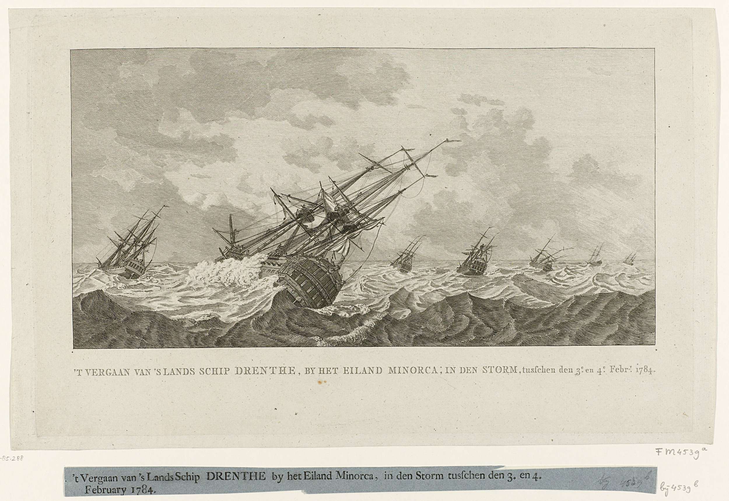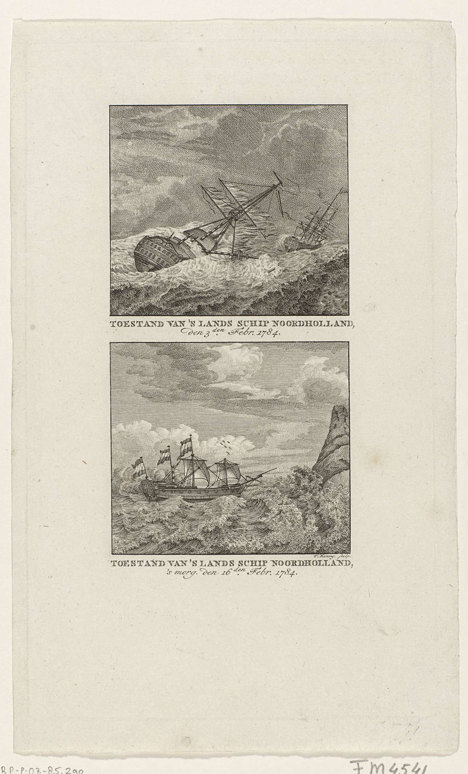 Schip Noord-Holland tijdens en na de storm, 1784