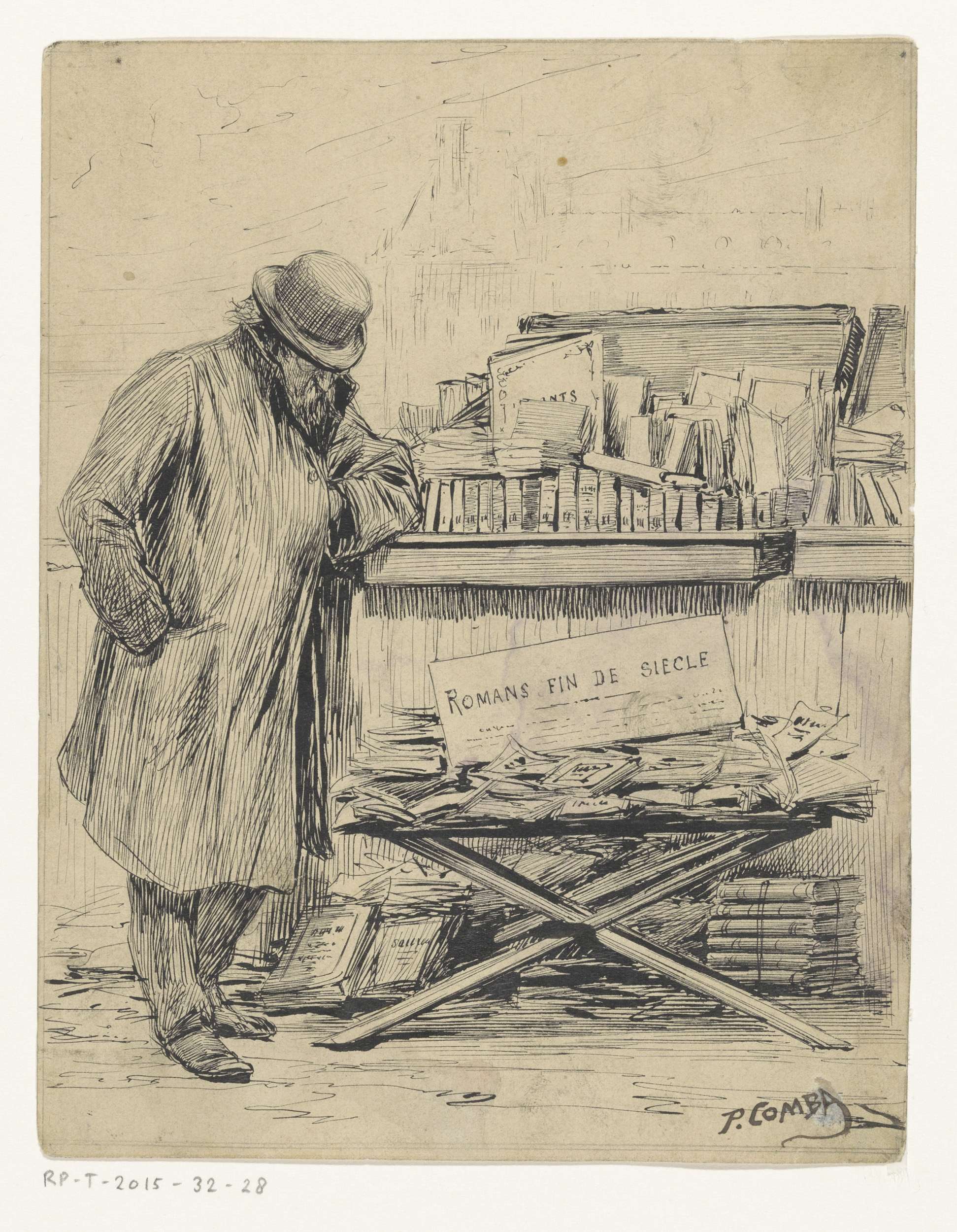 Boekhandelaar naast zijn boekenkraam op een kade