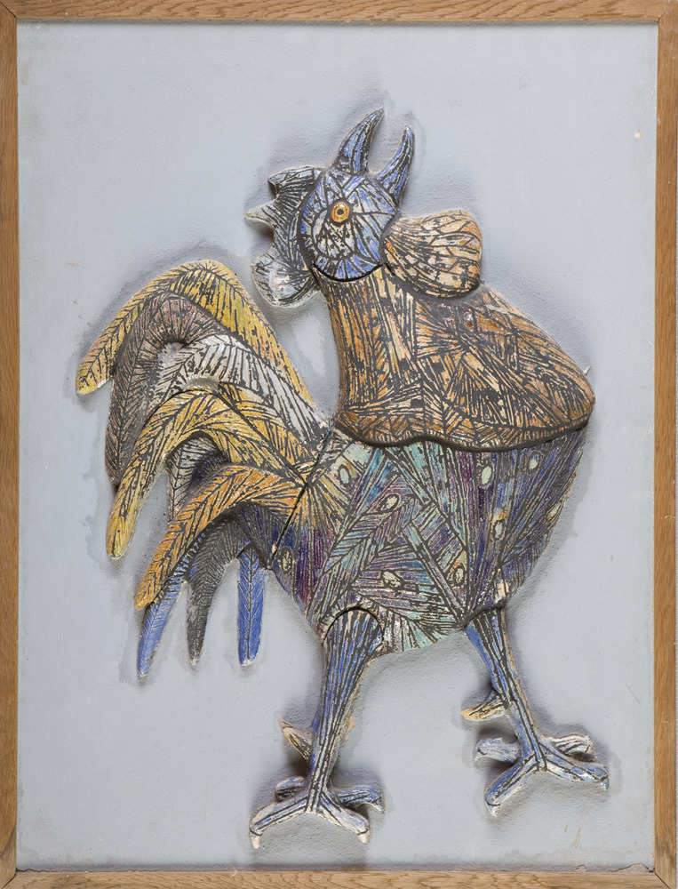 Keramisch reliëf met haan, gemaakt bij de Faïence- e...