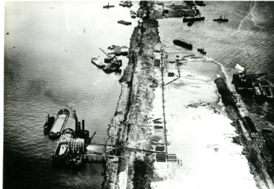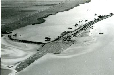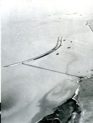 Luchtfoto van aanleg van een dijk, waarschijnlijk Oo...