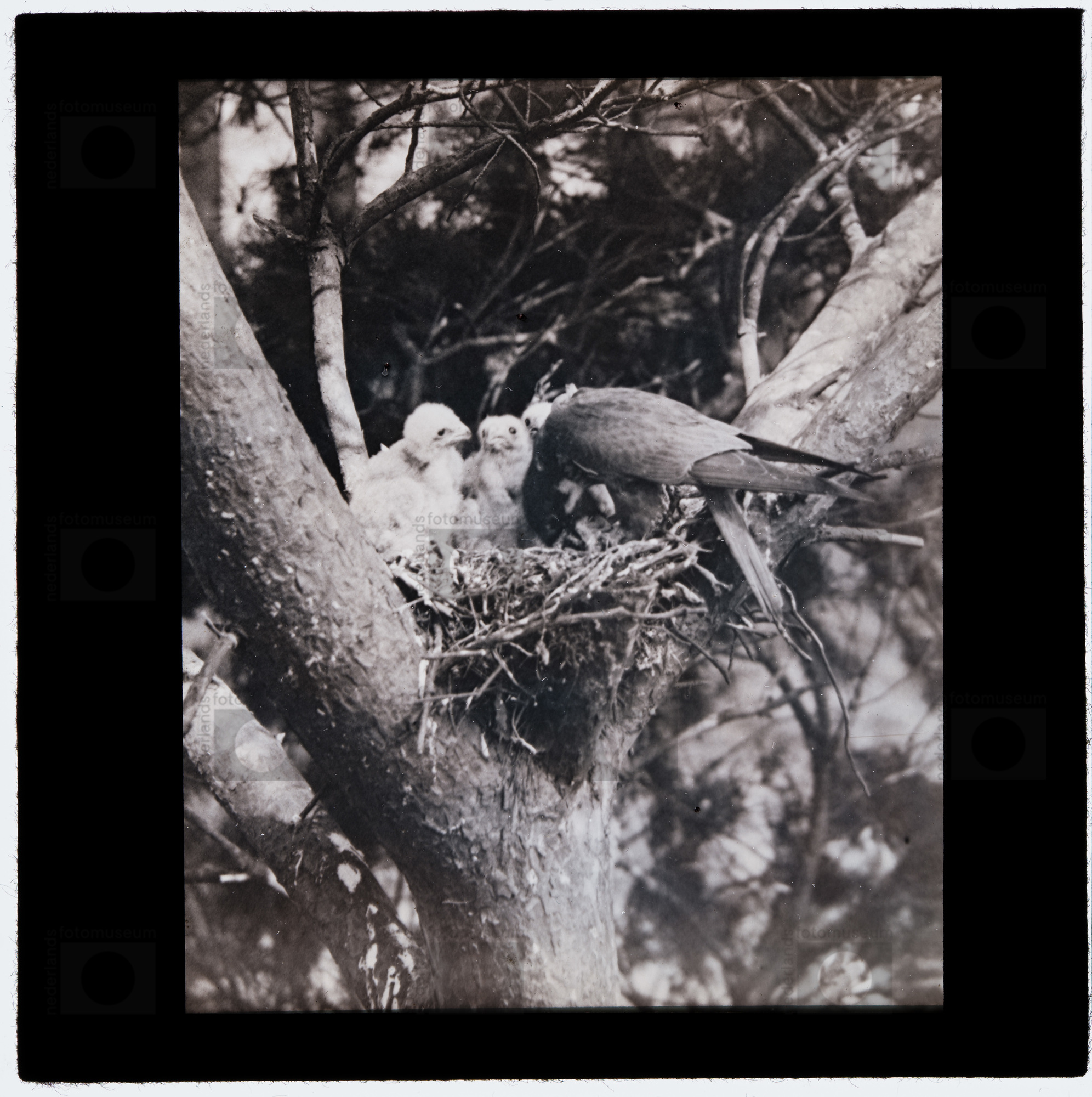 Boomvalk bij nest met jongen (1925-1940)