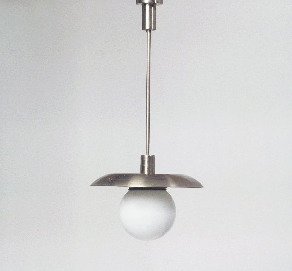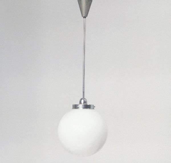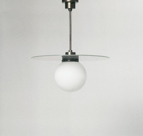 Hanglamp met bolvormige ballon en glasschijf aan pen...
