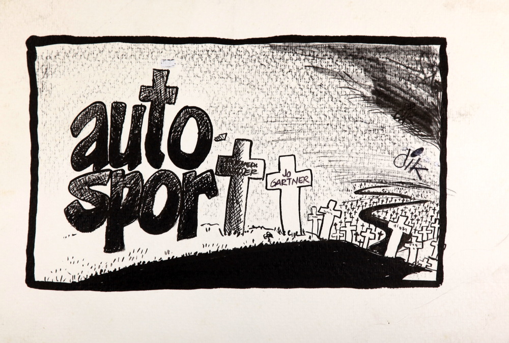 Karikatuurtekening: doodgevaarlijke autosport Jo Gar...