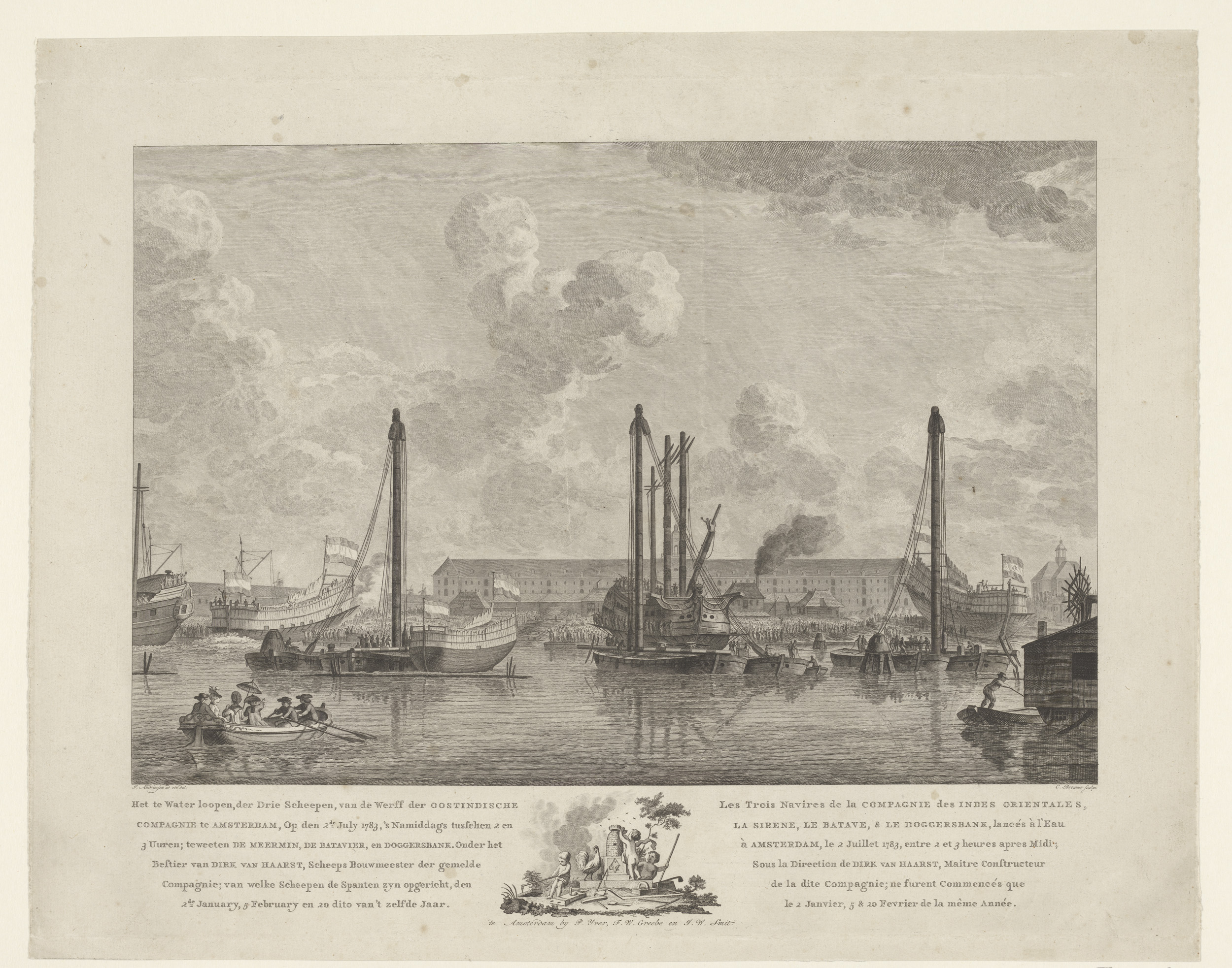 Tewaterlating van drie schepen te Amsterdam, 1783