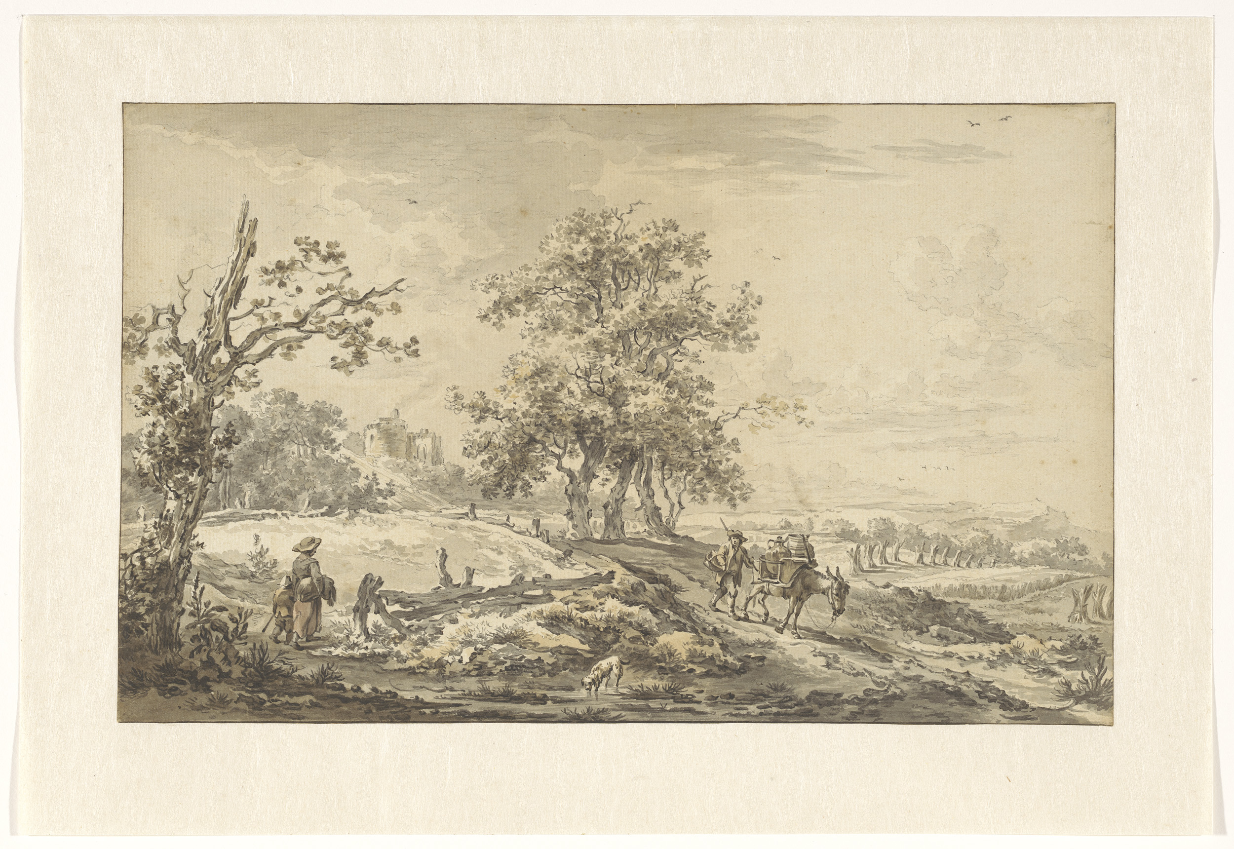 Vrouw met kind en man met ezel in landschap