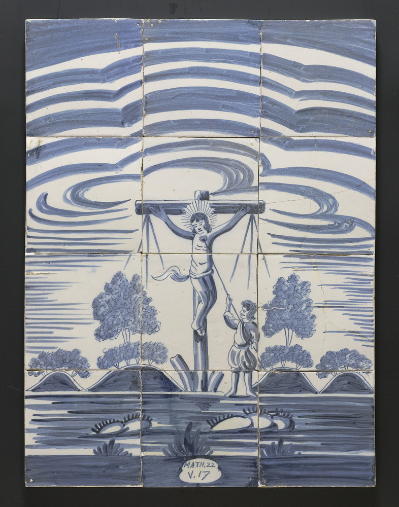 Tegeltableau van keramiek, tinglazuur, met een bijbe...