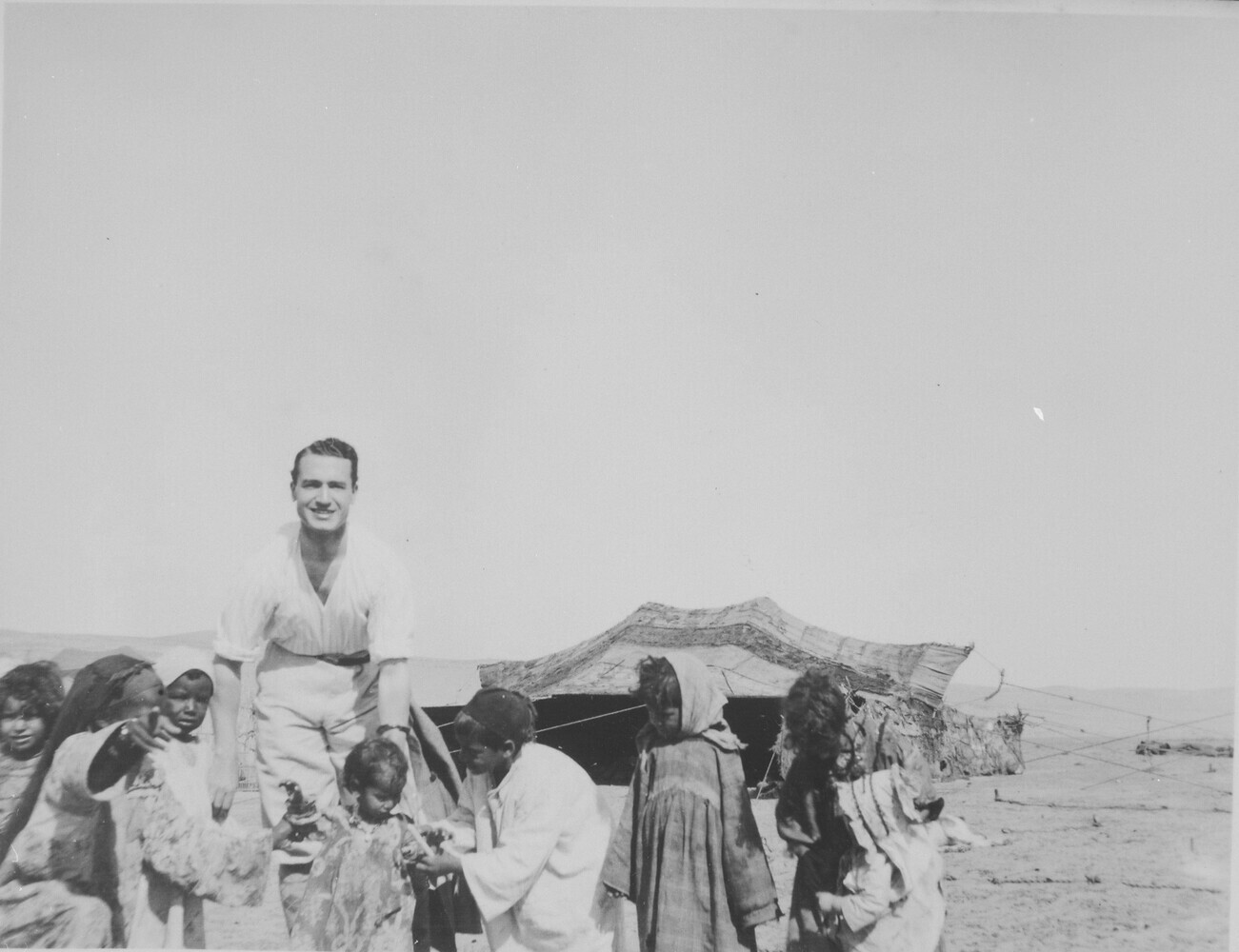 Charles Sayers met kinderen bij een tent in de woest...
