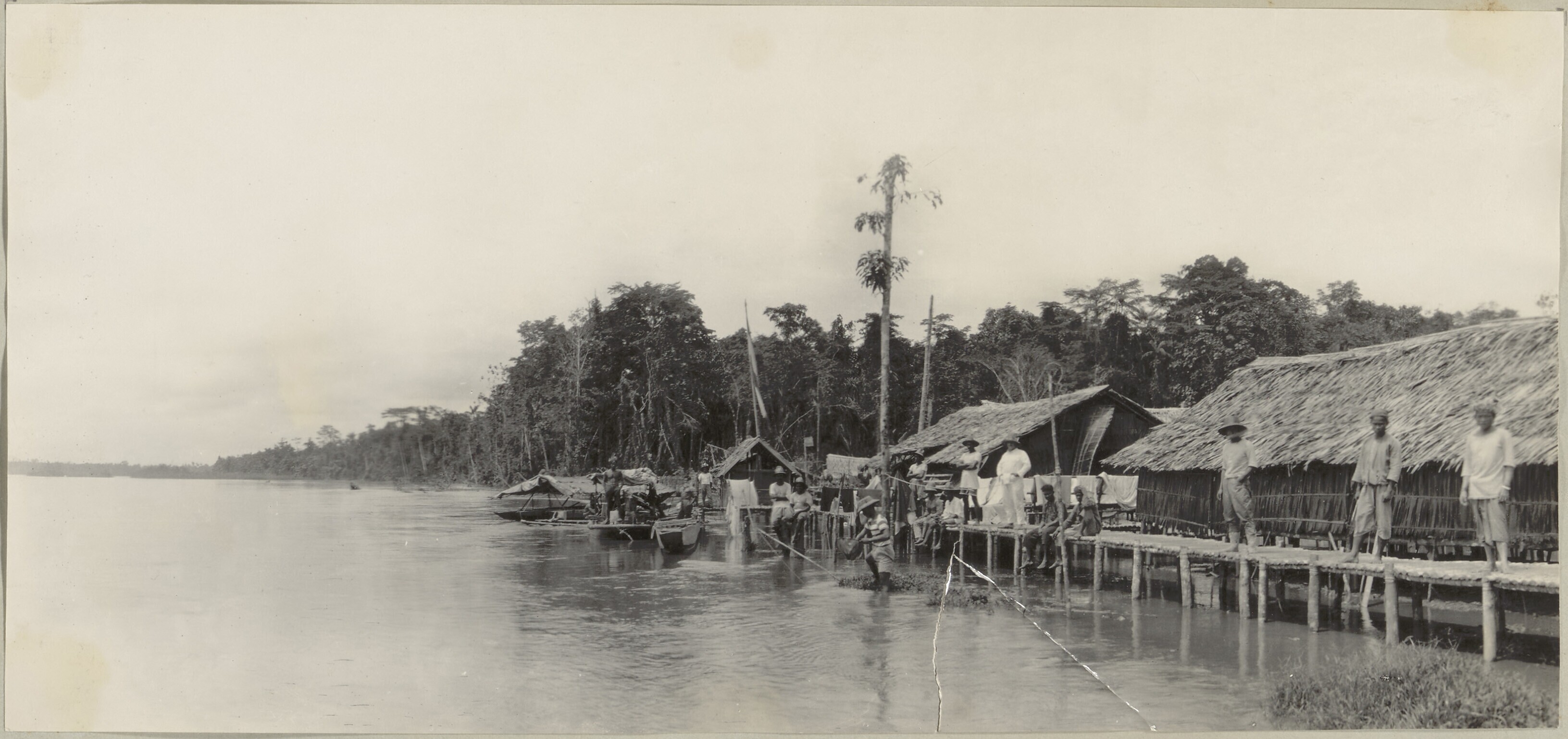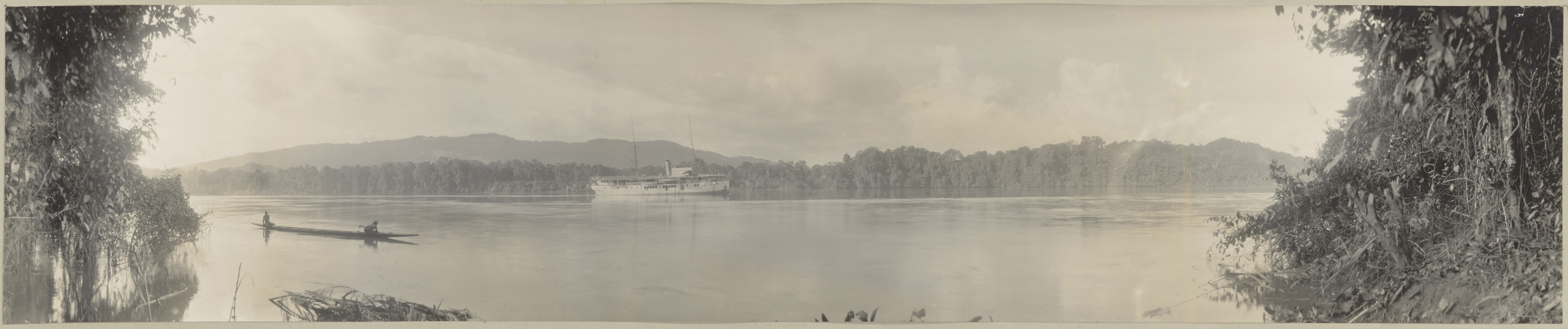 Een prauw met Dajak dragers en het expeditieschip Al...