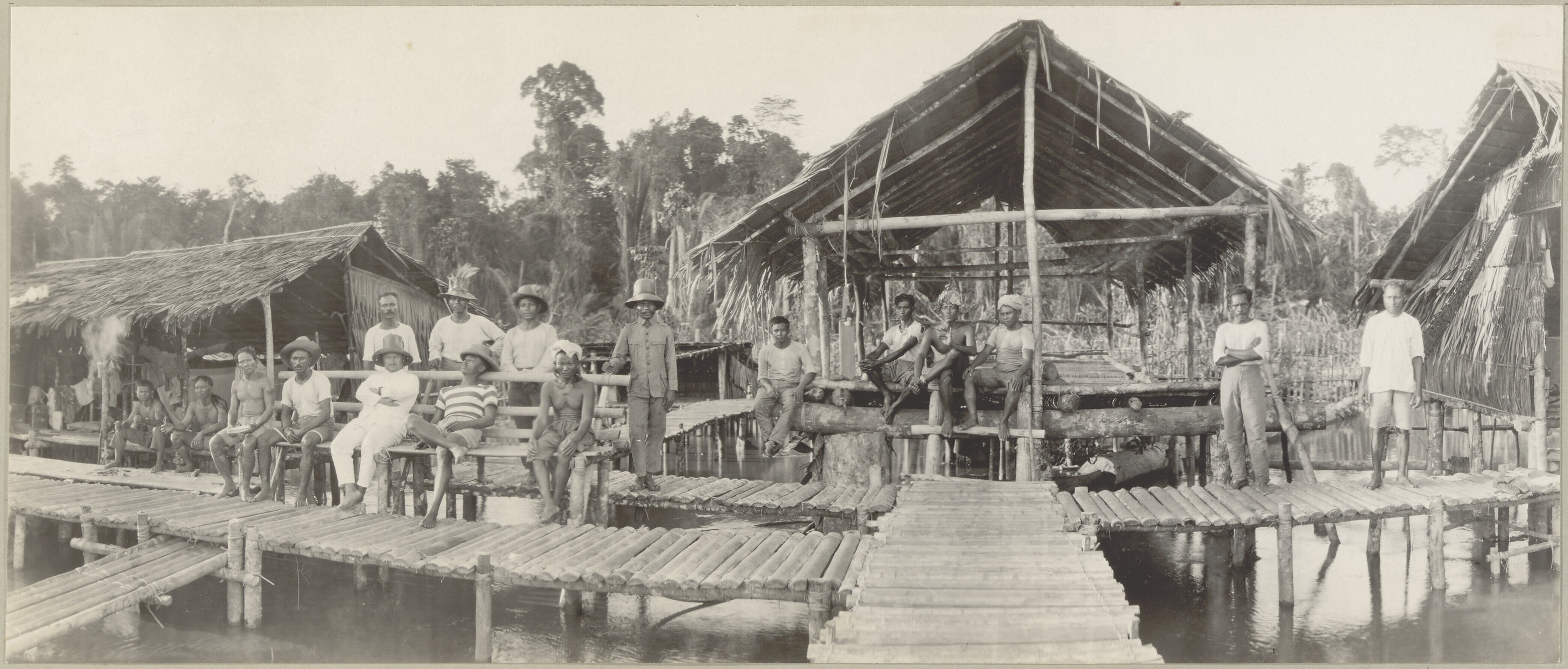 Groepsportret met Dajak dragers en de bivakcommandan...
