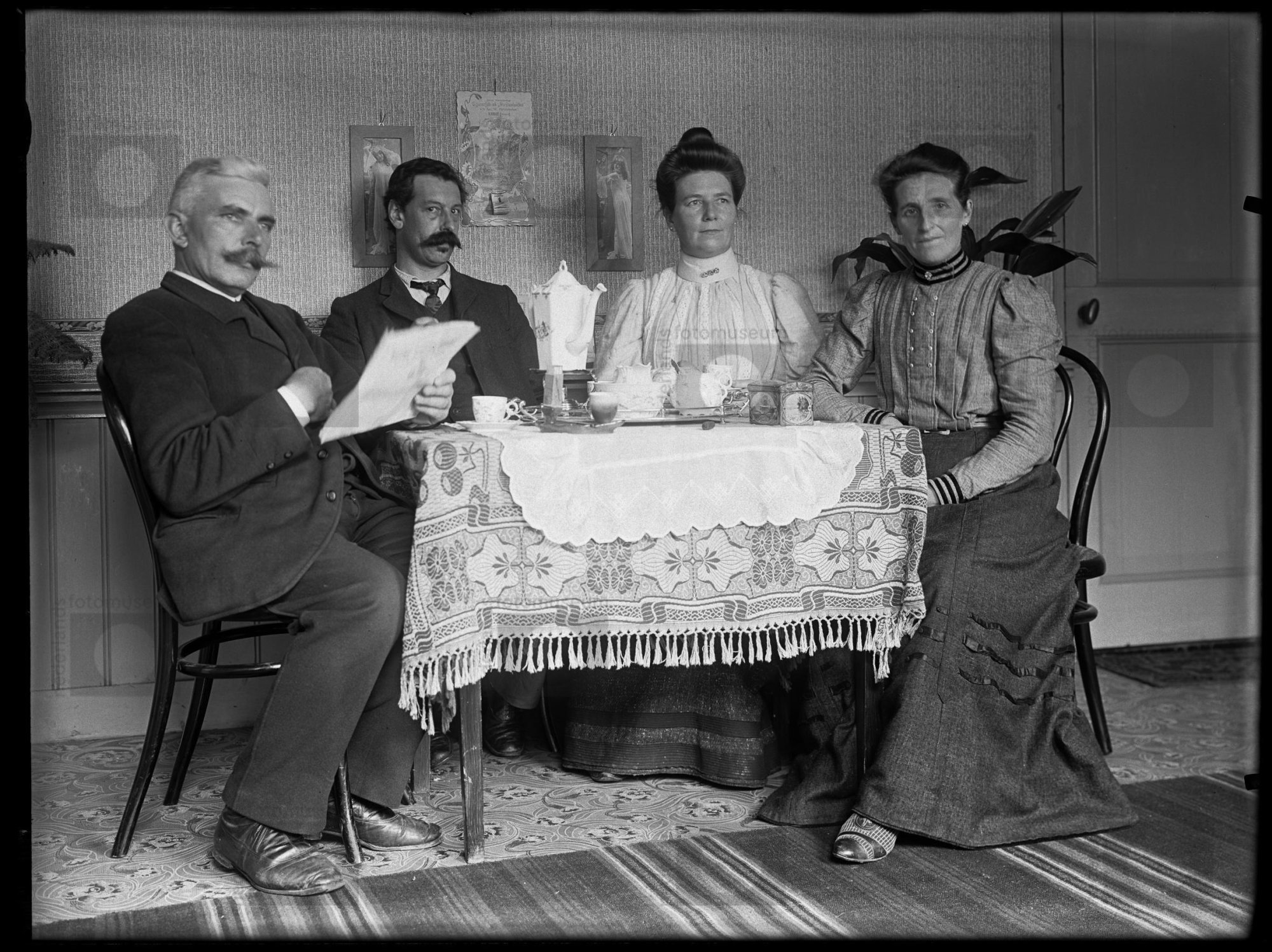 Echtpaar Y. Koppen, pensionhouders, achter de tafel ...