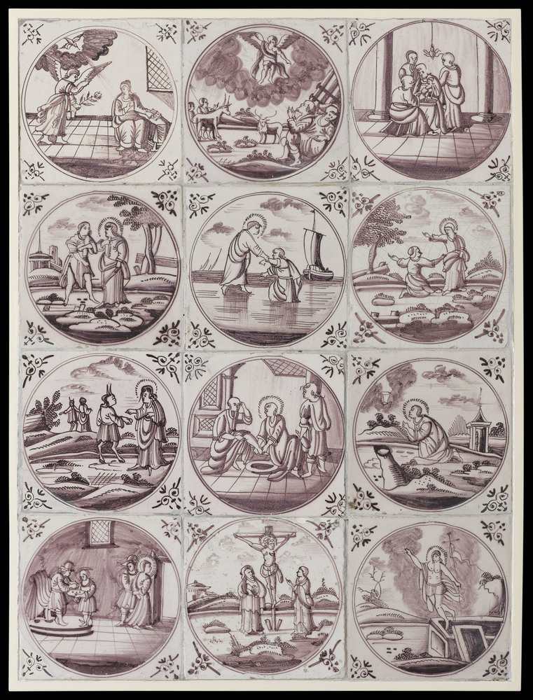 Tegelveld van keramiek, tinglazuur, voorstellende ee...
