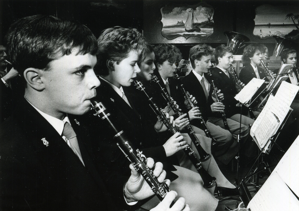Zwart-wit foto van leden van de Leo Harmonie Lobith ...