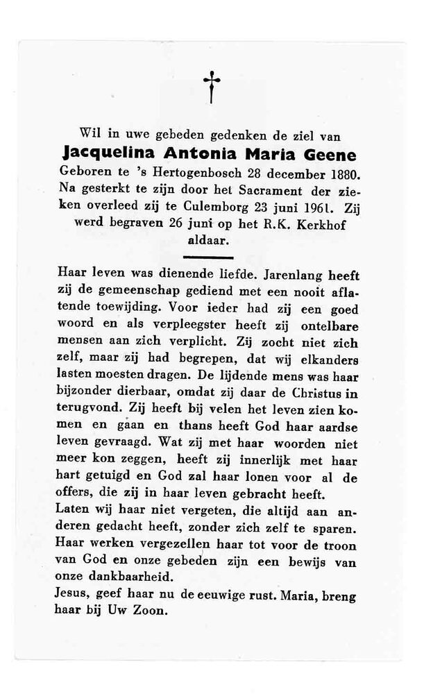 bidprent voor Jacquelina Antonia Maria Geene. Gebore...
