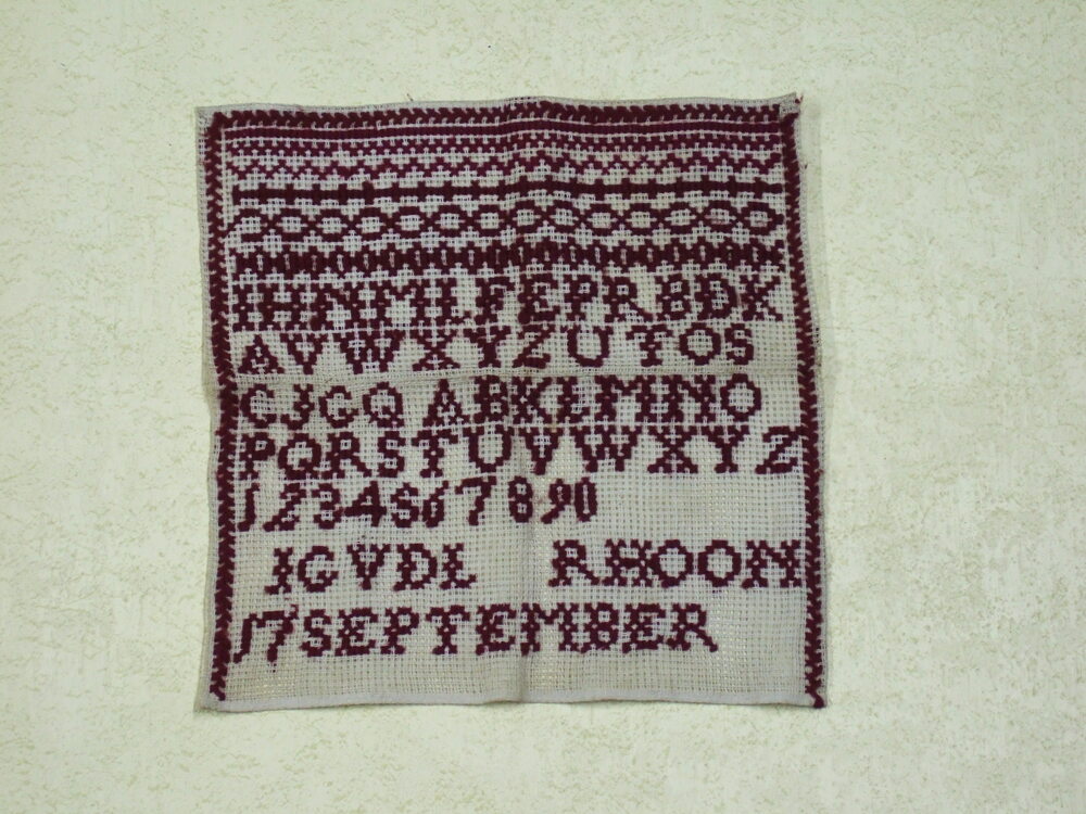 Merklap van stramien en wollen garen vervaardigd doo...