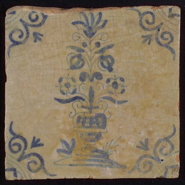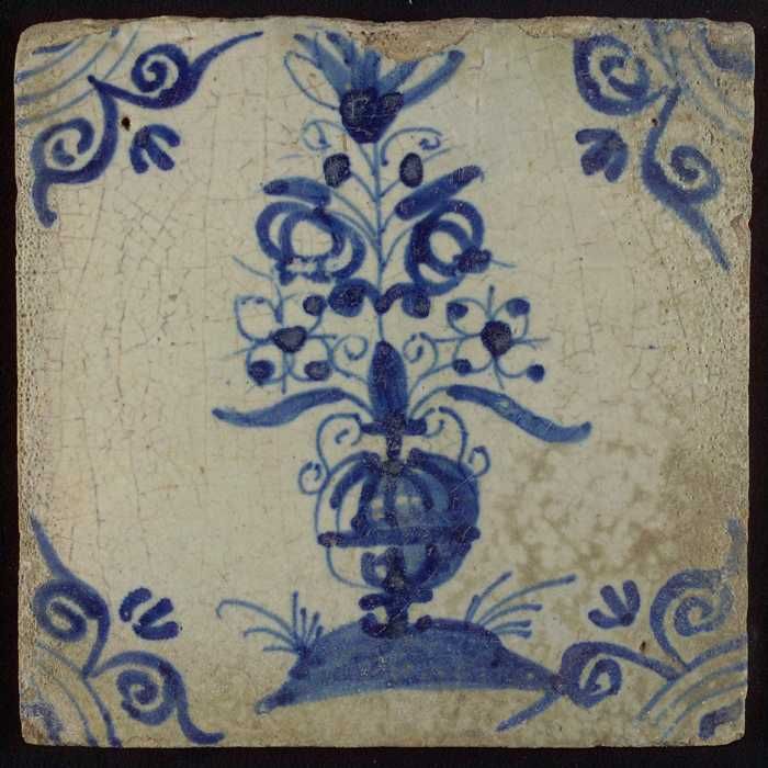 Tegel, bloemenvaas, blauw decor wit fond, hoekmotief...