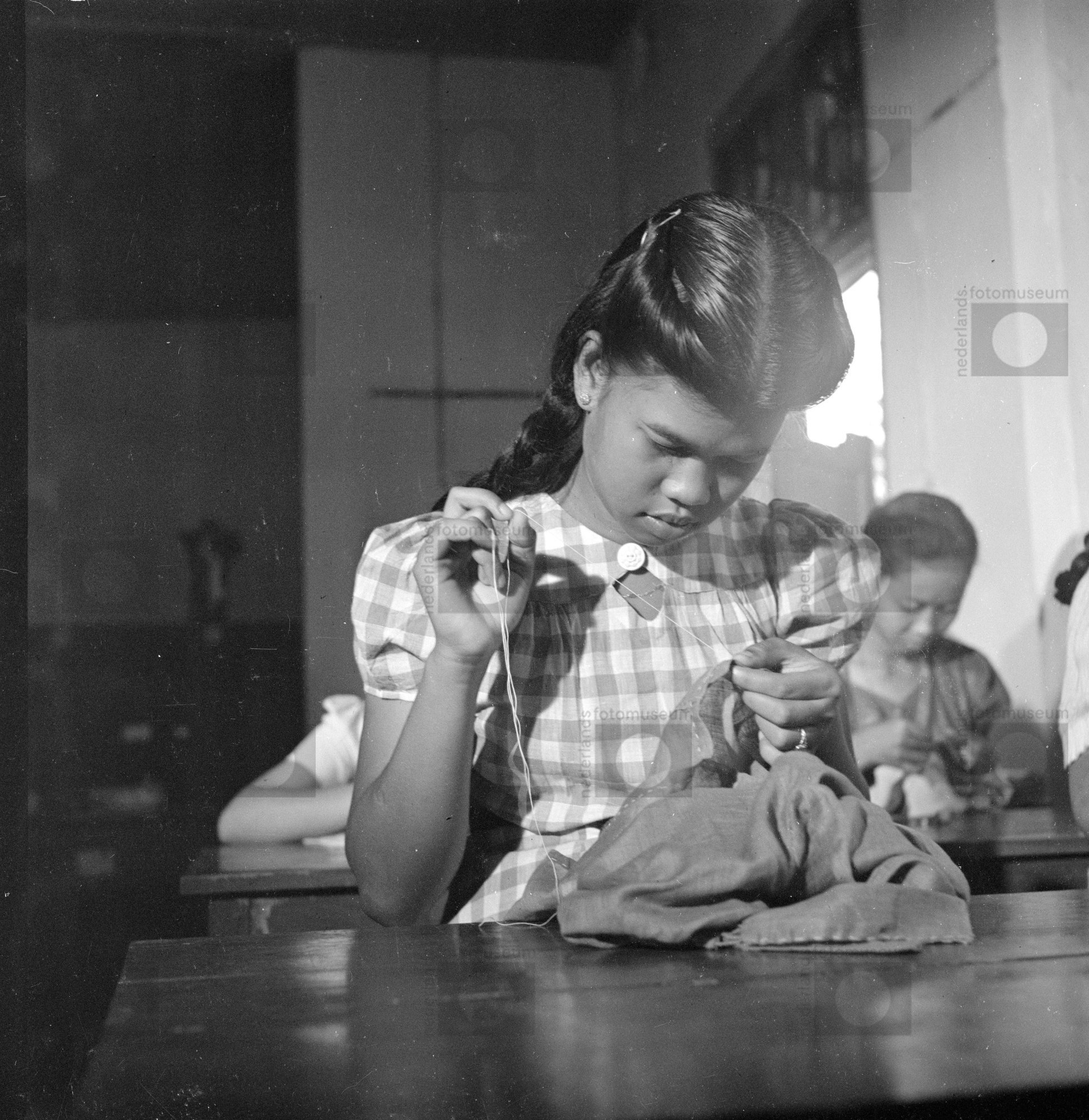 Een meisje krijgt naailes op een huishoudschool te J...