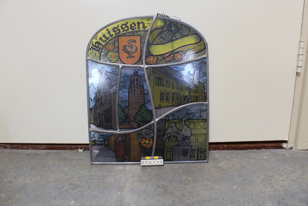 Glas-in-loodraam met afbeeldingen van Huissen