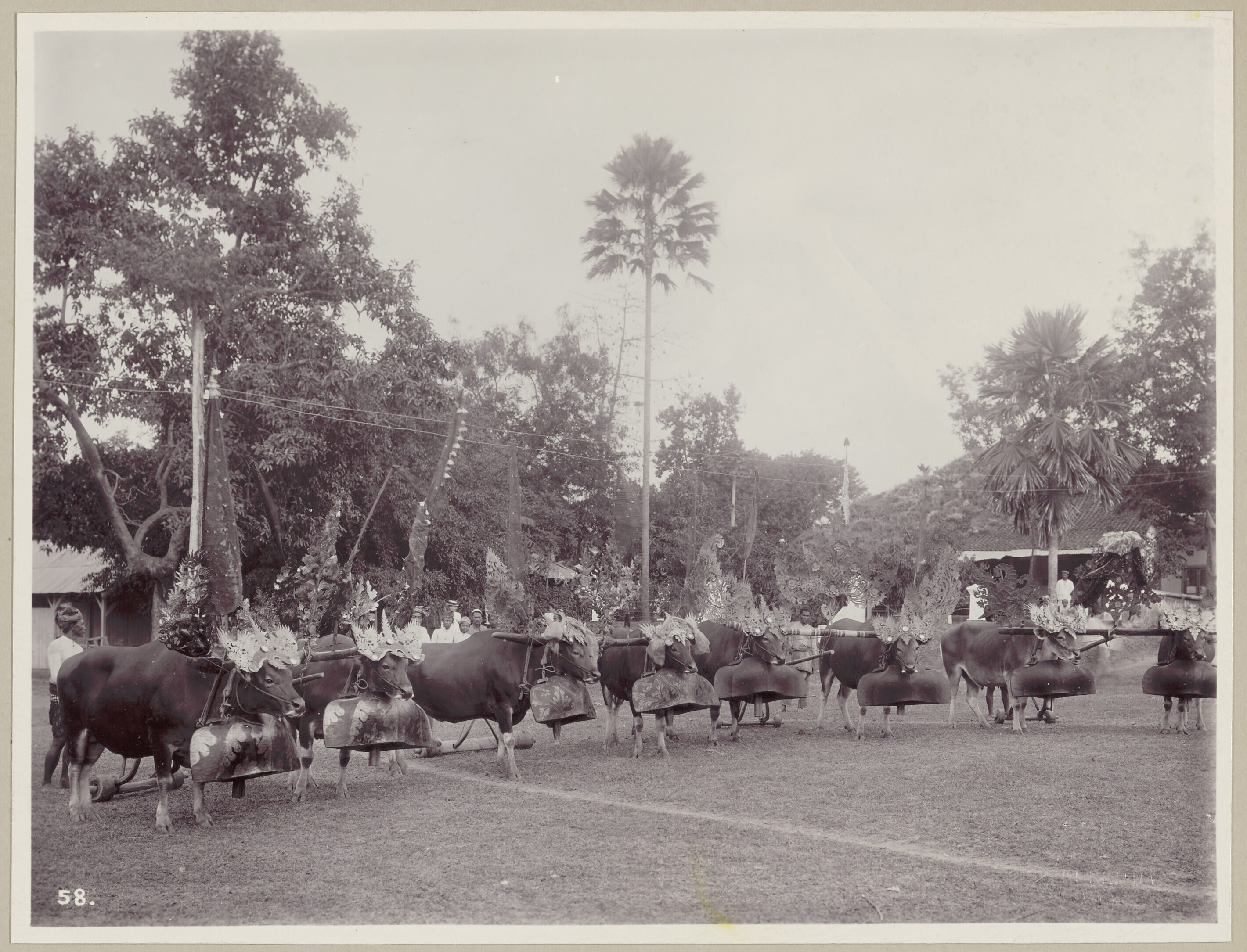 Voor de wedrennen opgetuigde stieren op Bali