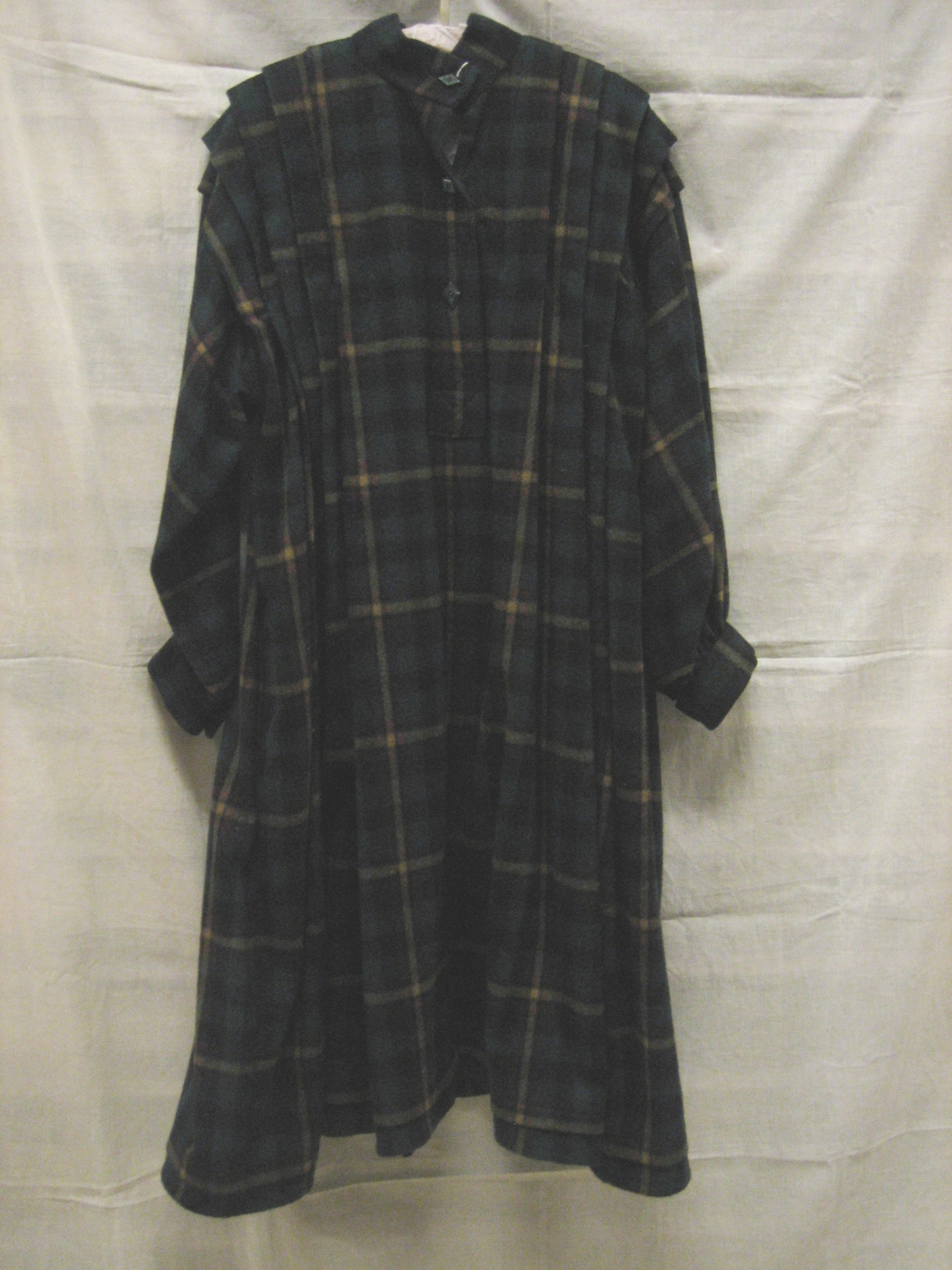 Jurk van donkergroene wol met ingeweven ruit in geel...