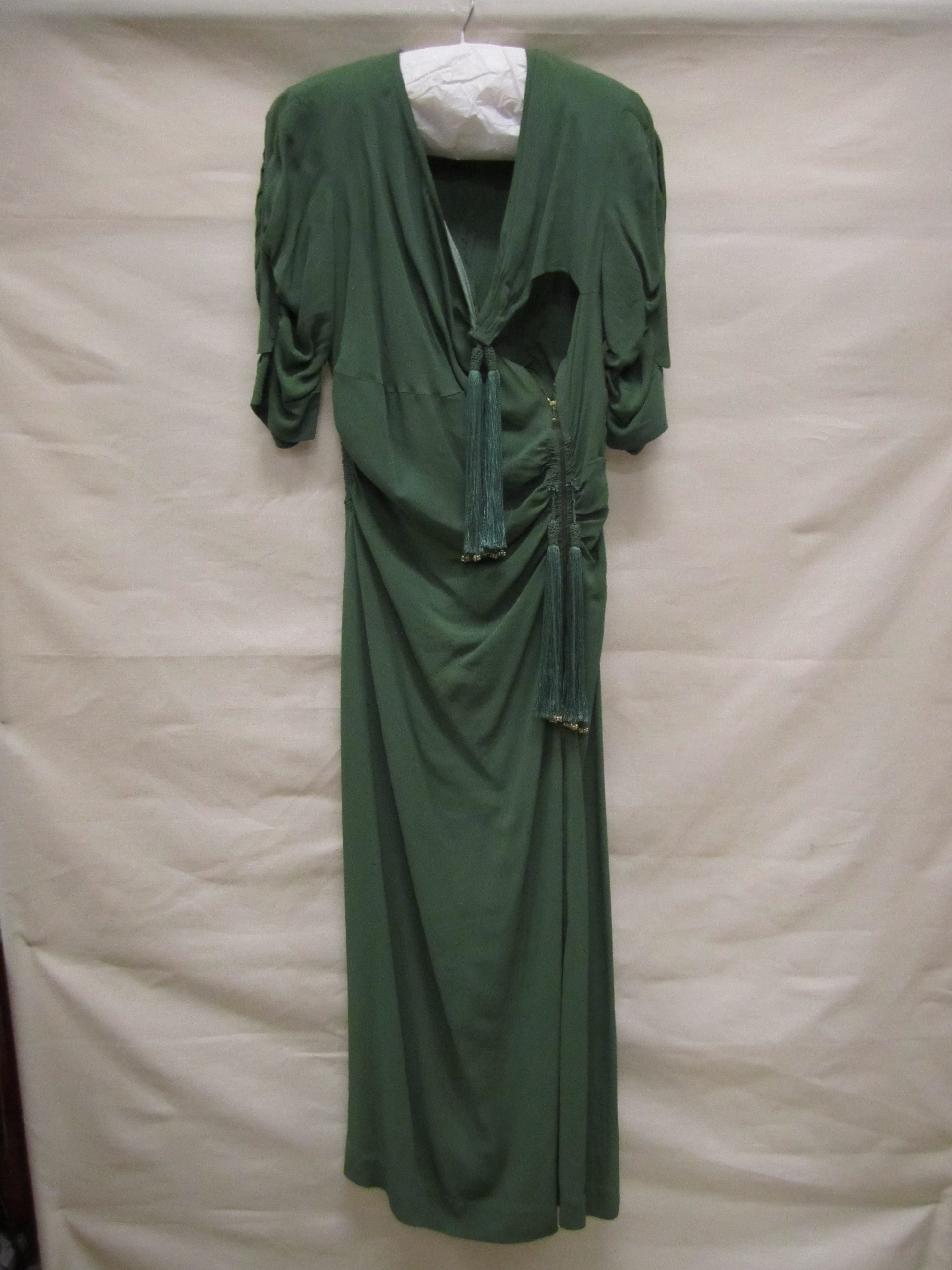Jurk van groene crêpekunstzijde met koperkleurige ri...
