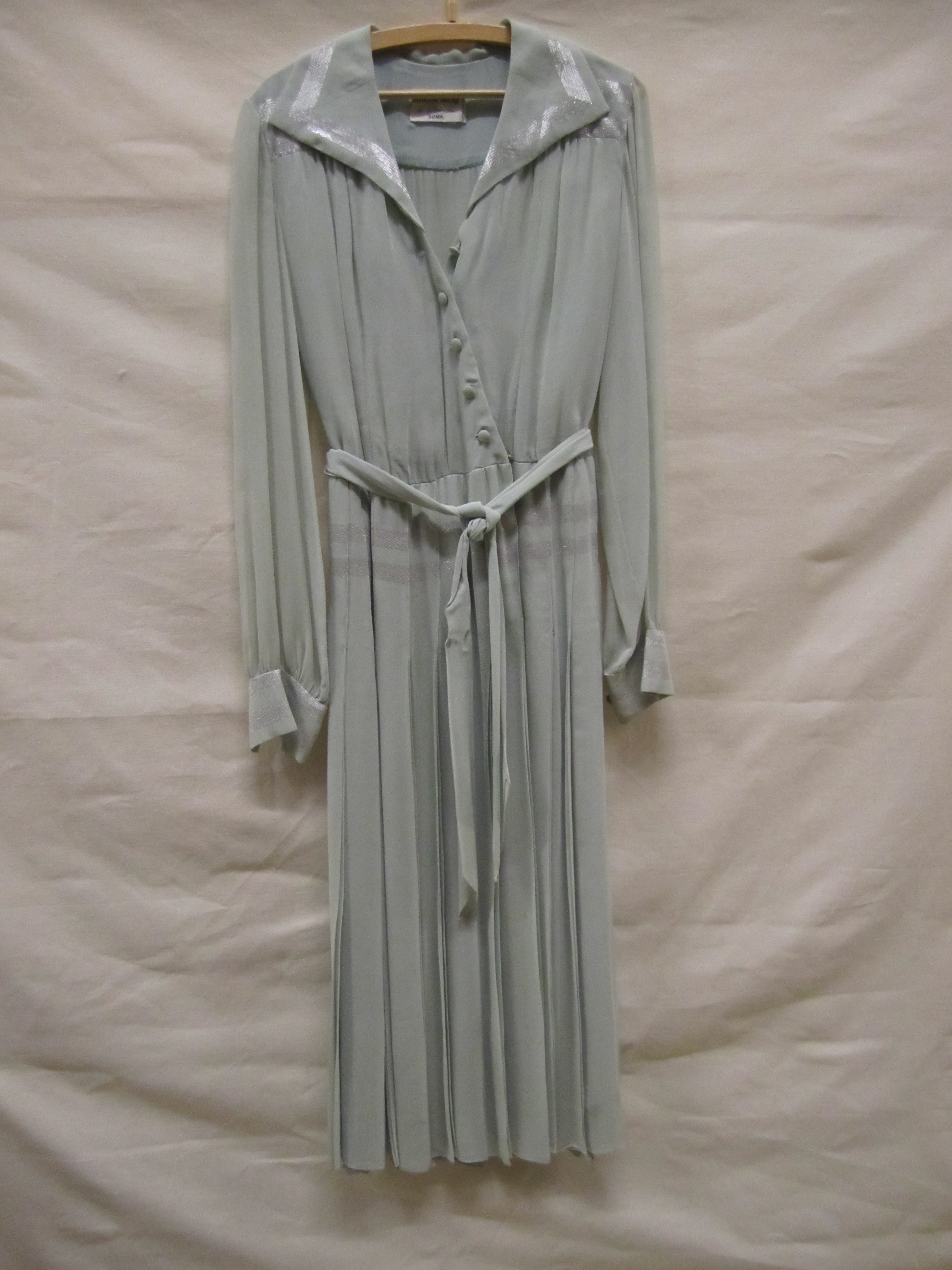 Jurk van licht mintgroene crêpezijde ingeweven met z...